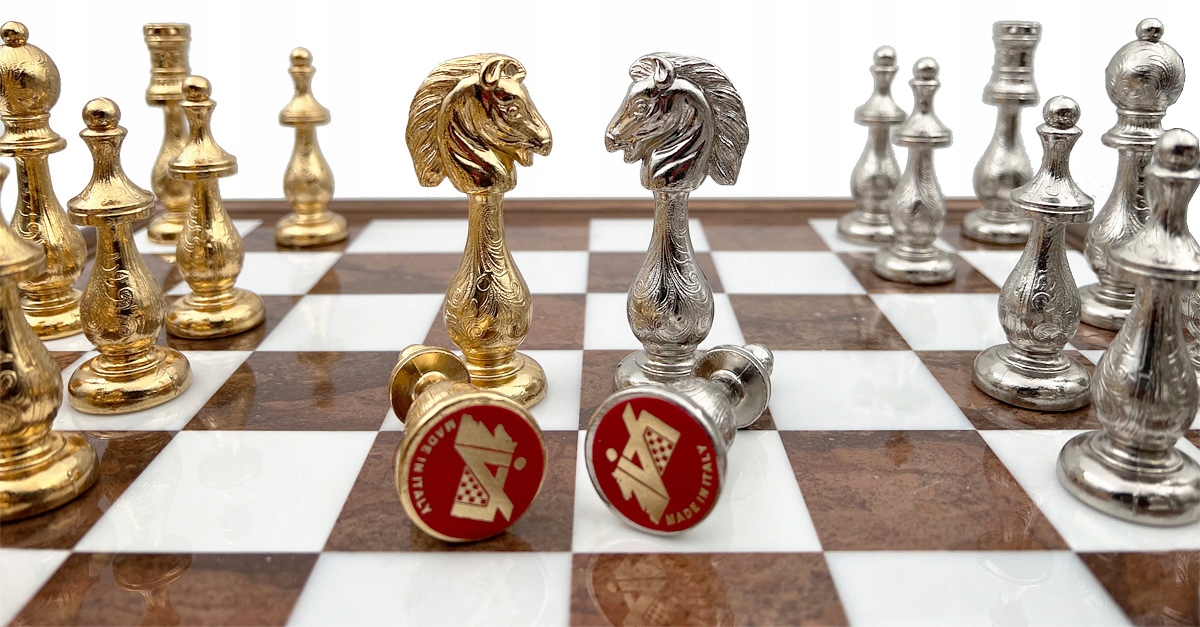 Шахи світу -відомий італійський бренд Italfama. Шахова дошка, виготовлена з дерева та мармуру. Розміри шахів: 47 х 47 х 10,5 см, розмір поля: 4,5 см. Фігури з колекції "Arabescato" виготовлені з цинку, покритого 24-каратним золотом та 925 сріблом. Висота короля: 10 см - Ø База 2,9 см.
