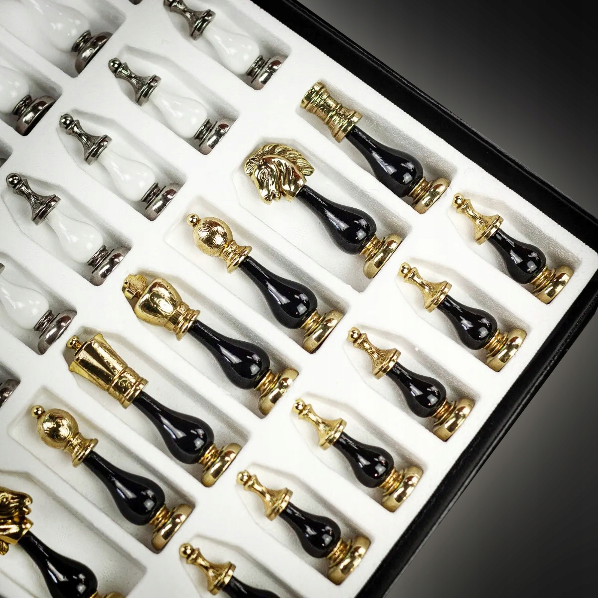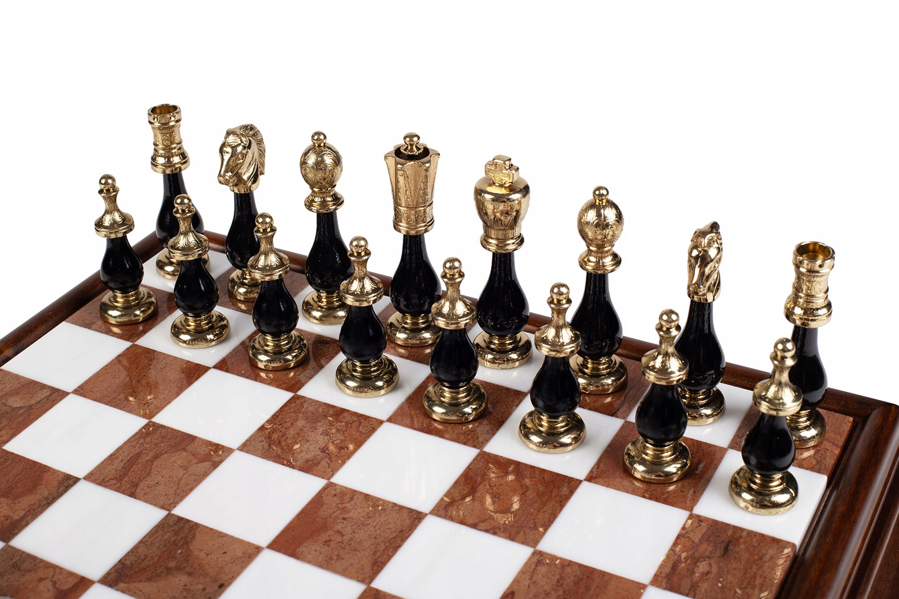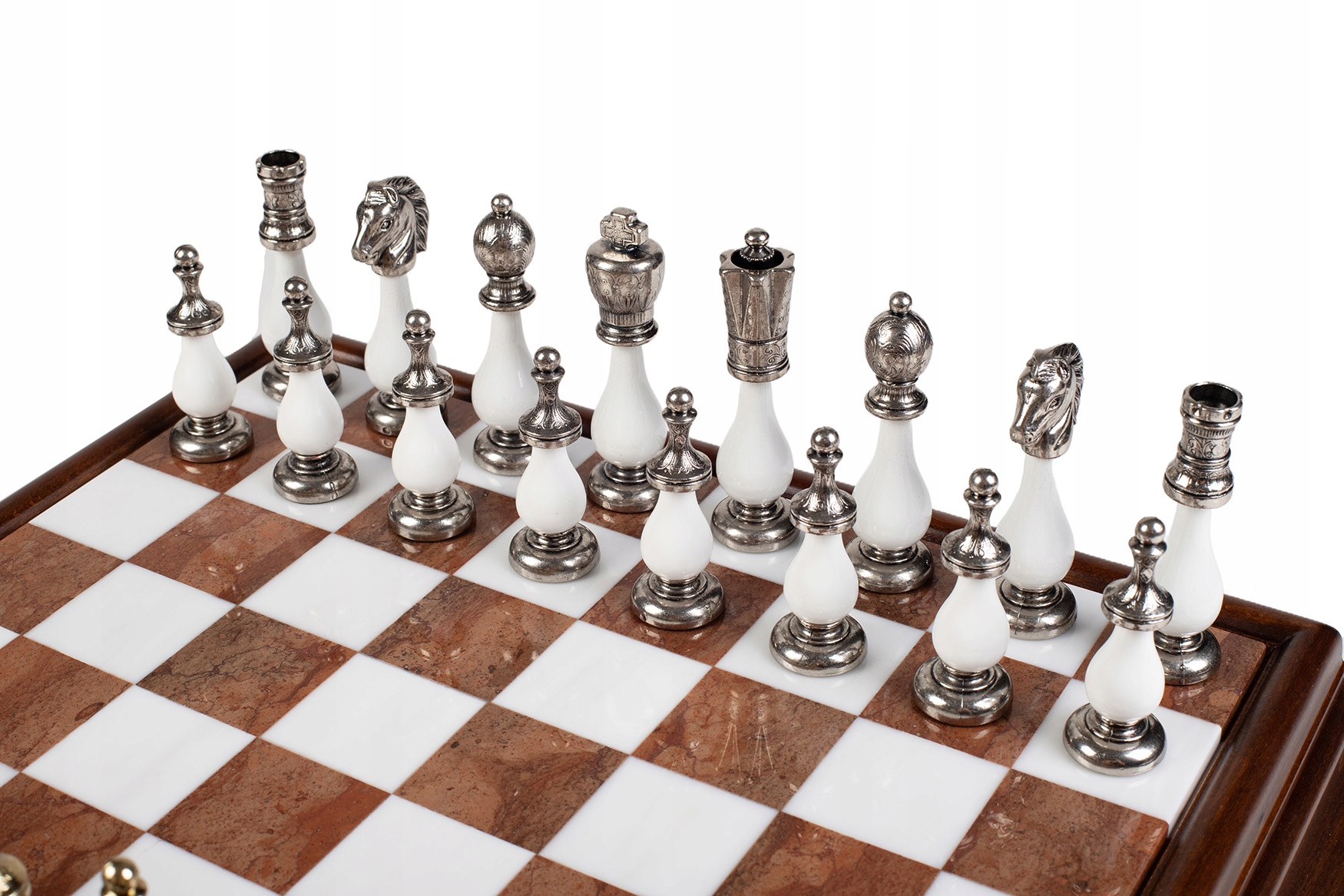Шахи світу -відомий італійський бренд Italfama. Шахова дошка, виготовлена з дерева та мармуру. Розміри шахів: 47 х 47 х 10,5 см, розмір поля: 4,5 см. Фігури колекції "Arabescato", виготовленої з цинку, латуні та нікелю. Висота короля: 10 см - Ø База 2,9 см.