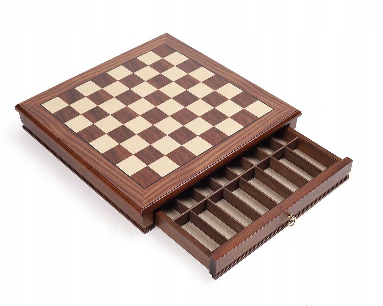 Шахова дошка з дерева з висувним ящиком для зберігання фігур. Розміри шахової дошки: 43 х 43 см, розмір поля: 4,4 см. Виробництво: Італія.