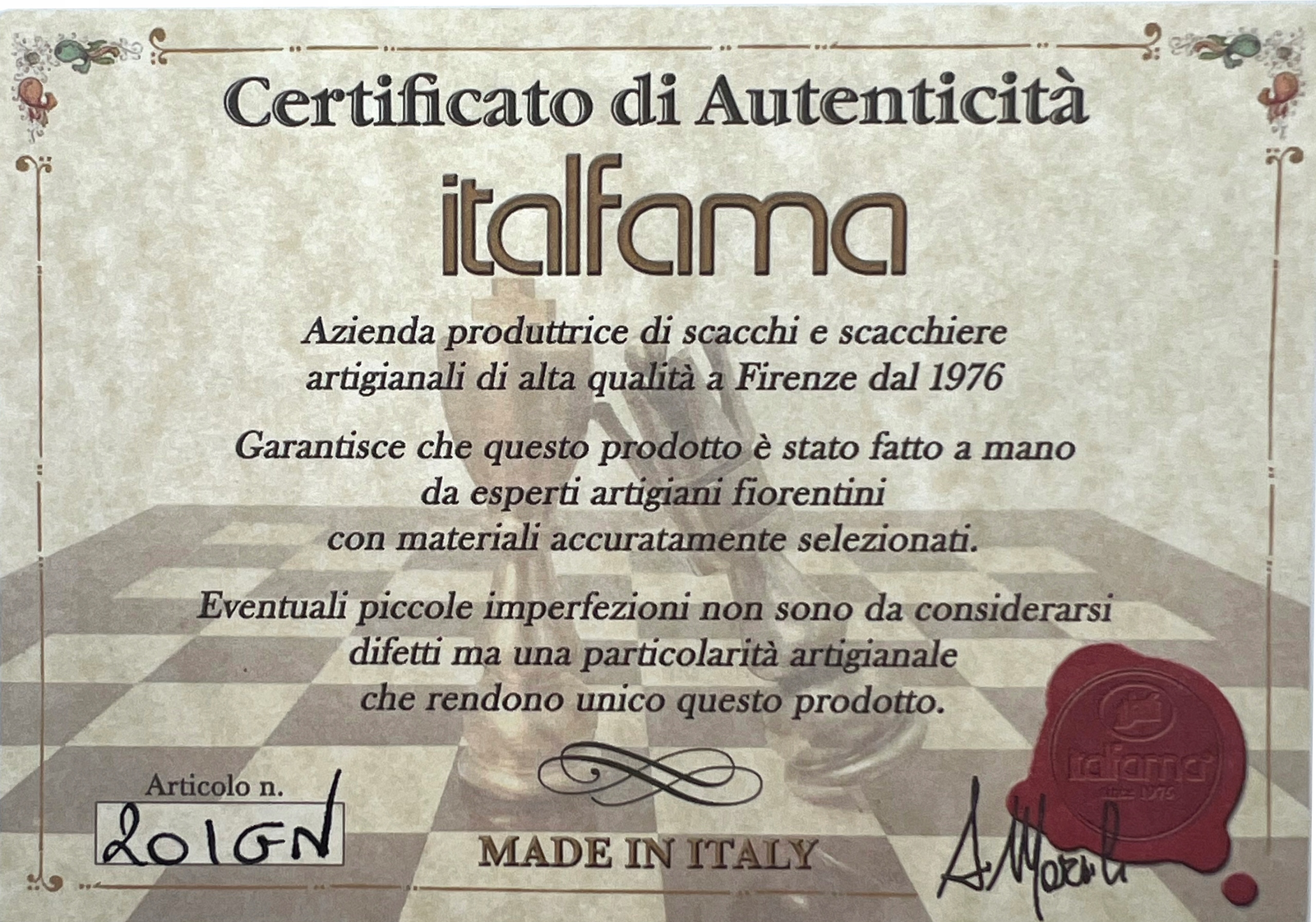 Шахові з світу -відомий італійський бренд Italfama. Шахова дошка, виготовлена з еко -ланцюга та дерева. Розміри шахової дошки: 33 x 33 x 1,5 см, розмір поля: 3,5 см.
