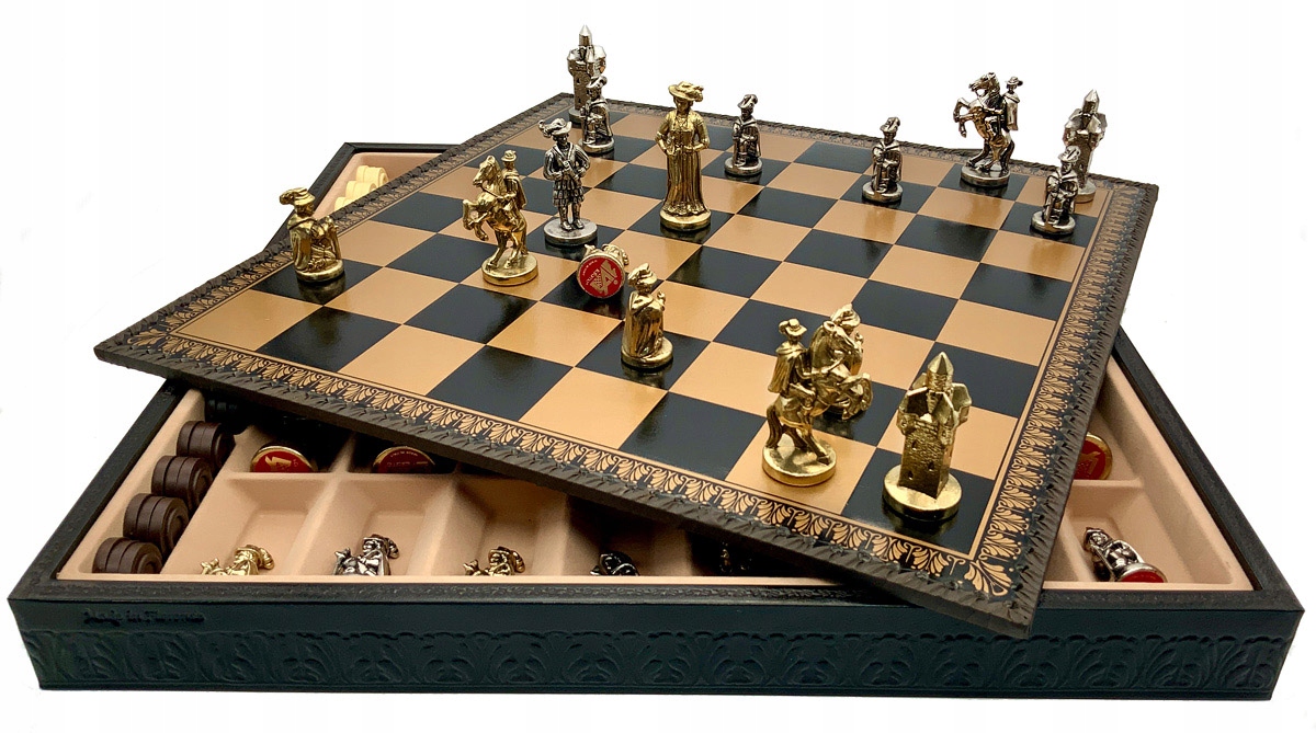 Шахи світу -відомий італійський бренд Italfama. Шахова дошка, виготовлена з екологічної шкіри. Розміри шахової дошки: 48 х 48 х 5,5 см, розміри поля: 5,2 см. Фігури з колекції "Lendsknecht", виготовленої з цинку, латуні та нікелю. Висота короля: 8,7 см - Ø База 3,1 см. Набір також містить шашки та Trittrak.