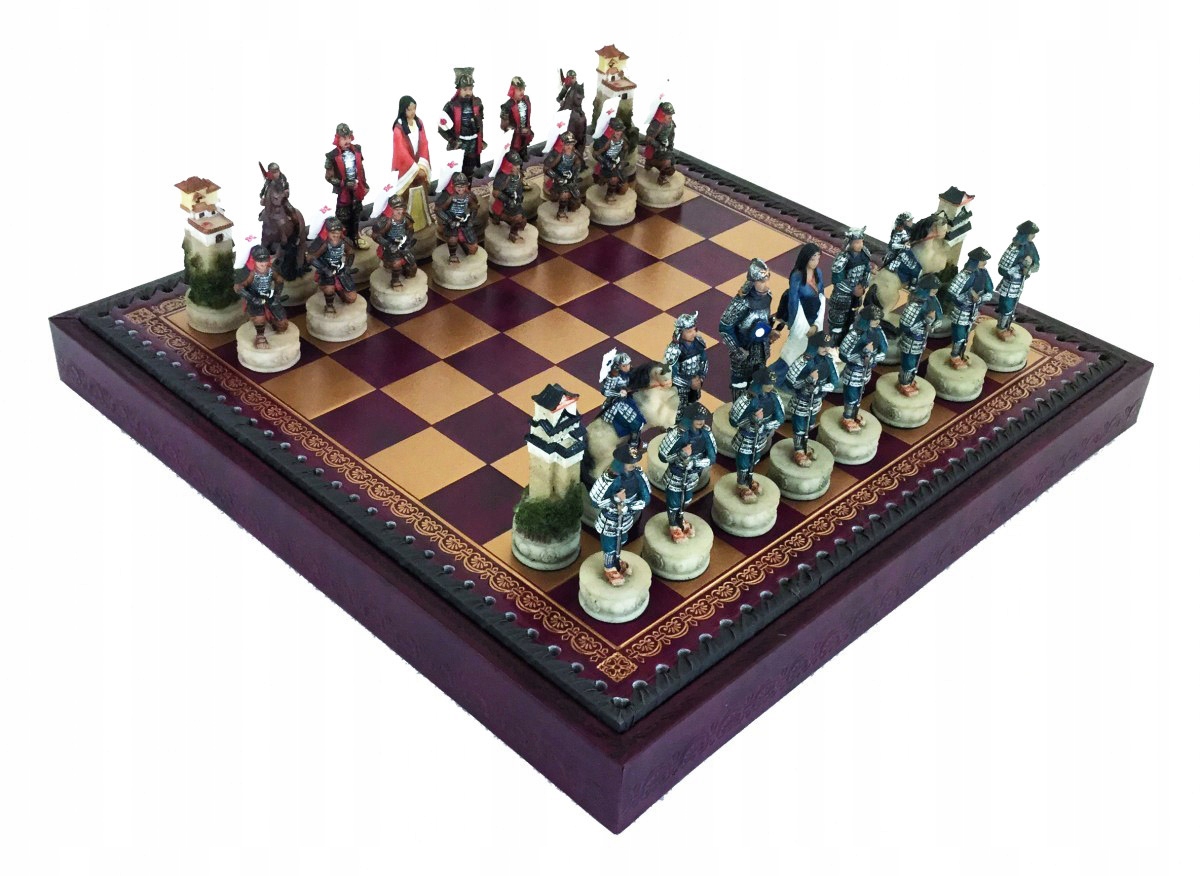 Ці шахові фігури із зображенням середньовічних самураїв виготовляються вручну з поліірезин і ретельно пофарбовані в найменші деталі італійськими майстрами. Шахова дошка виготовлена з еко -ланцюга. Розміри шахової дошки: 35 х 35 х 4 см, розмір поля: 3,5 см. Висота короля: 8 см. Набір включає пішаки для шашки та елементів, які можна грати в Trytrak. Виготовлено в Італії.