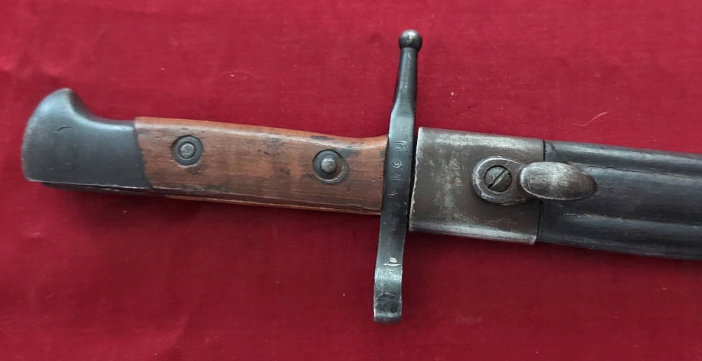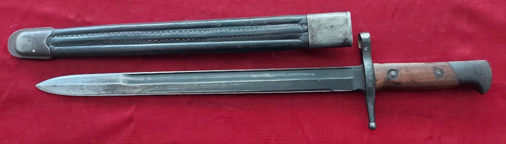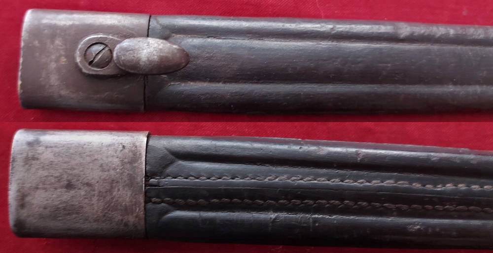 Шкіряна піхва зі сталевою фурнітурою (латунні фурнітури частіше). Шкіра дуже добре збережена. Він жорсткий, він не висушений, оригінальний шов повністю збережений. Байонет хороший у піхві.
