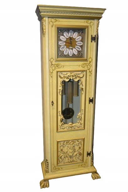 гарний італійський підлоговий годинник. Коробка годинника покрита лаком з імітацією тріщин. Шкатулка прикрашена різьбленням і декорами ручного розпису. механізм чверть години (3 гирі) механізм не робочий. елегантний годинник для дизайну інтер'єру, який створить теплу, елегантну та позачасову атмосферу. стан . Коробка гарна, є незначні сліди використання. механізм на даний момент не працює. висота 179 см, ширина 69 см. основний 34 см.