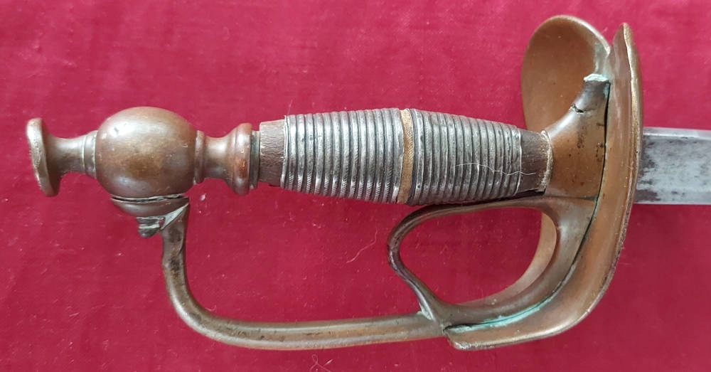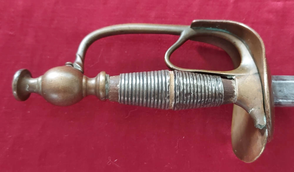 Річ на фото, добре збереглася. Лезо невідточене, злегка заточене, вкрите темним нальотом. Рама ручки виготовлена з латуні. Поперечина має видимі пошкодження, відсутній шматок біля пластини. Серцевина - оригінальна деревина, покрита оригінальним листовим металом. Кільця на цівці та наверші відсутні. Ручка ослаблена.