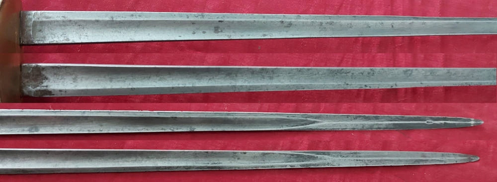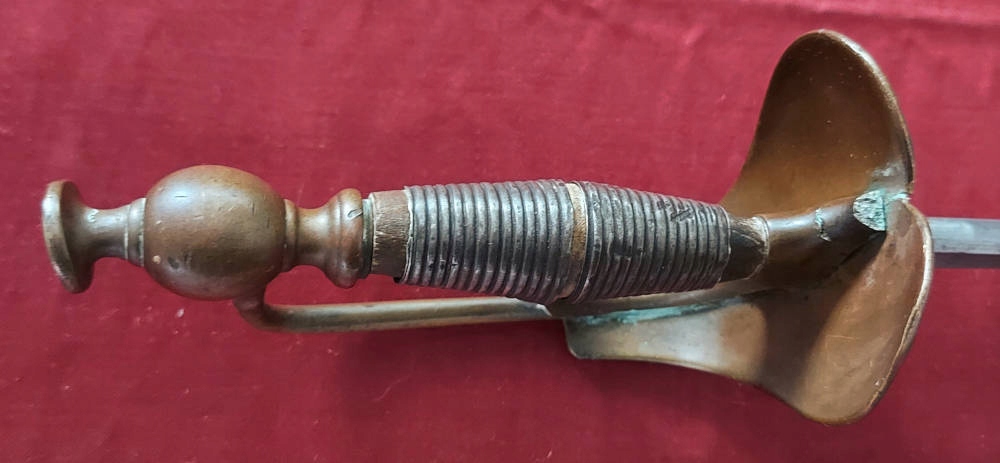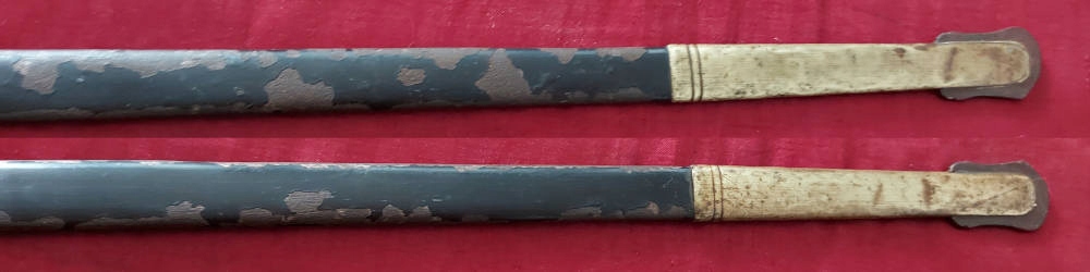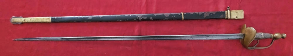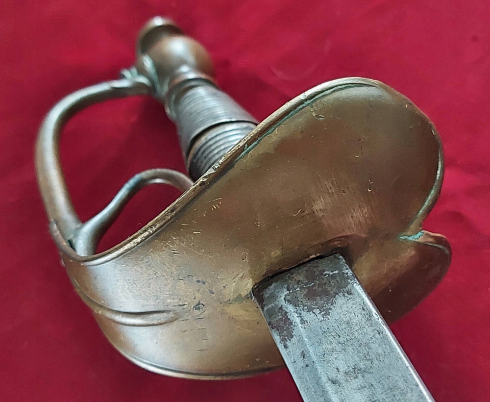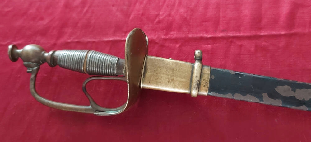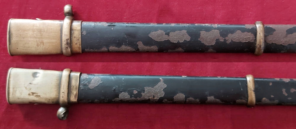 Піхви металеві, збережено 50-60% оригінальної чорної фарби. Фурнітура латунь. Клинок трохи розлітається в піхвах.