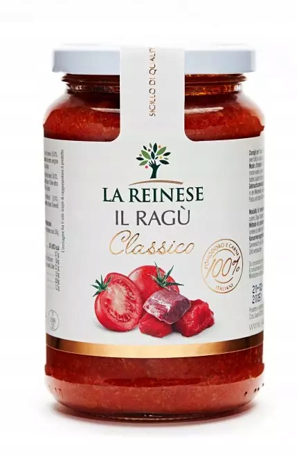 Високоякісний італійський соус рагу на основі томатної м’якоті з яловичиною та свининою, оливковою олією першого віджиму та овочами: морквою, селерою, цибулею та додаванням солі. Класичний традиційний рецепт, інгредієнти якого, помідори та м’ясо, використані для приготування цього рецепту, на 100% італійського походження. Після розігріву соус готовий до подачі.
