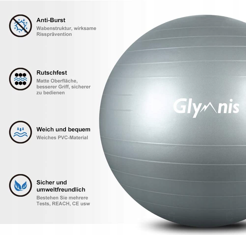 Система проти розриву: м’яч Glymnis має товщину 2000 мікрон і використовує новітню технологію захисту від розриву. При ударі по м'ячу гострим предметом він не вибухає, як повітряна кулька, а повільно витікає. Однак перед використанням м’яча ми рекомендуємо переконатися, що на землі чи поблизу неї немає гострих предметів, щоб не пошкодити матеріал. Протиковзкий і зносостійкий: тренажер Glymnis виготовлений з безпечного і нетоксичного полівінілхлориду (ПВХ), не містить фталатів і пройшов перевірку SGS. - Матова поверхня забезпечує міцне захоплення. Лінії проти ковзання на 360° і стільникова структура на поверхні м'яча мають відмінну міцність і властивості проти ковзання. Багатофункціональність: ідеально підходить для пілатесу, йоги, гімнастики, тренувань спини, аеробіки, тренувань живота, гімнастики для вагітних, фізіотерапії та реабілітаційних тренувань. Він також ідеально підходить як м'яч для сидіння в офісі чи вдома, він покращує поставу та зменшує біль у спині. Різні розміри та кольори: три розміри: діаметр 55 см (підходить для зростання 150 ~ 160 см), 65 см (160 ~ 165 см), 75 см (> 165 см). Сім кольорів: чорний, сріблястий, фіолетовий, рожевий, синій, бірюзовий і салатовий. Спосіб застосування: надути м'яч приблизно на 85% від його загального діаметра. Зачекайте ще 24 години, перш ніж накачати його до рекомендованого розміру