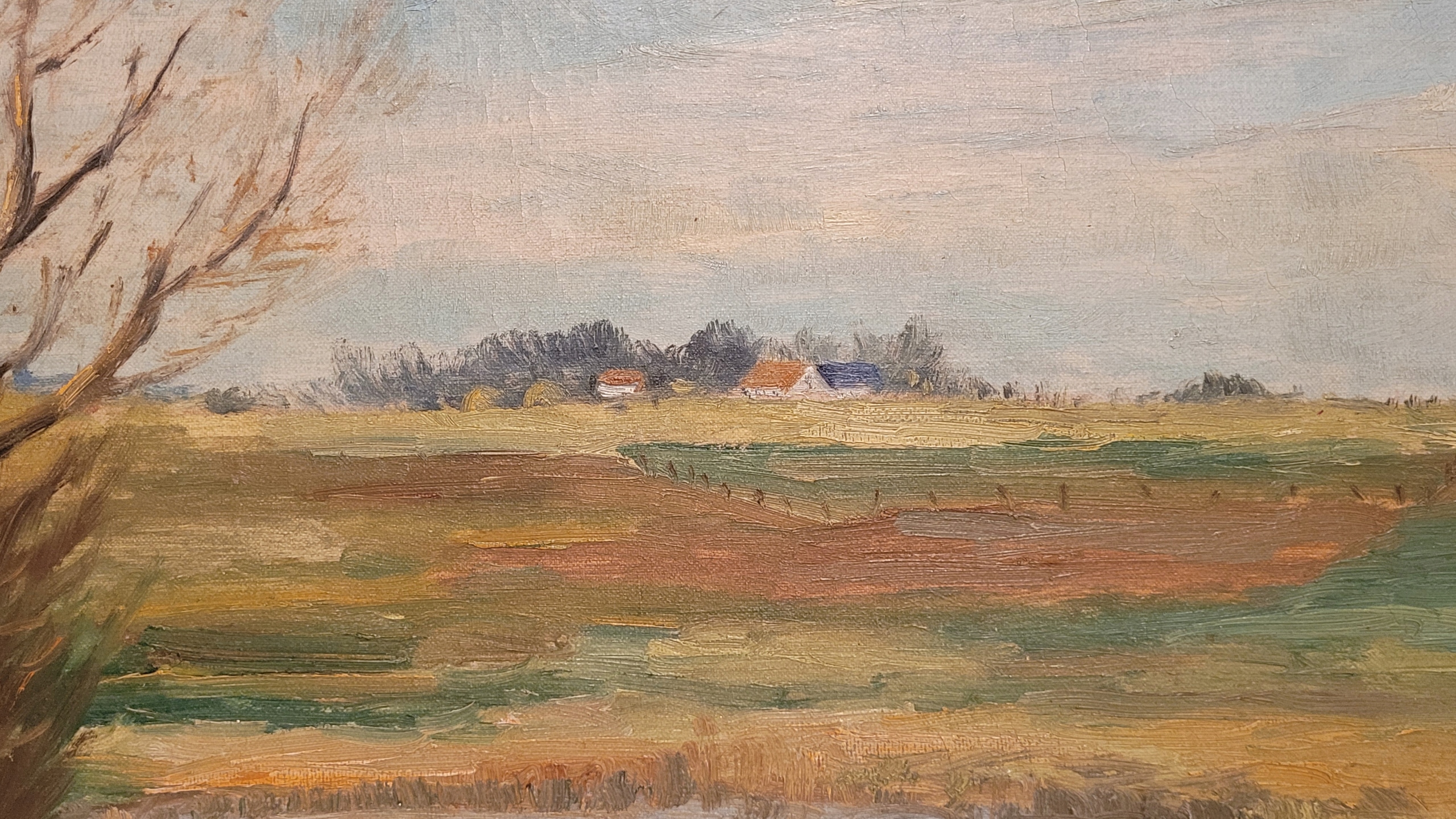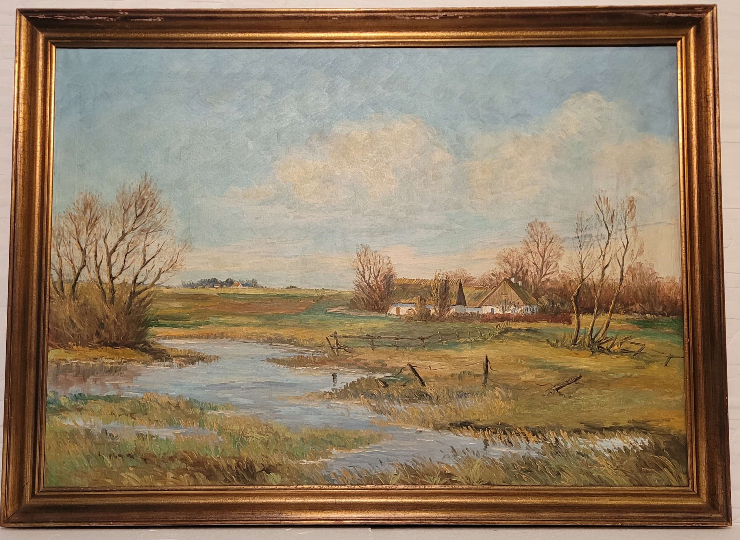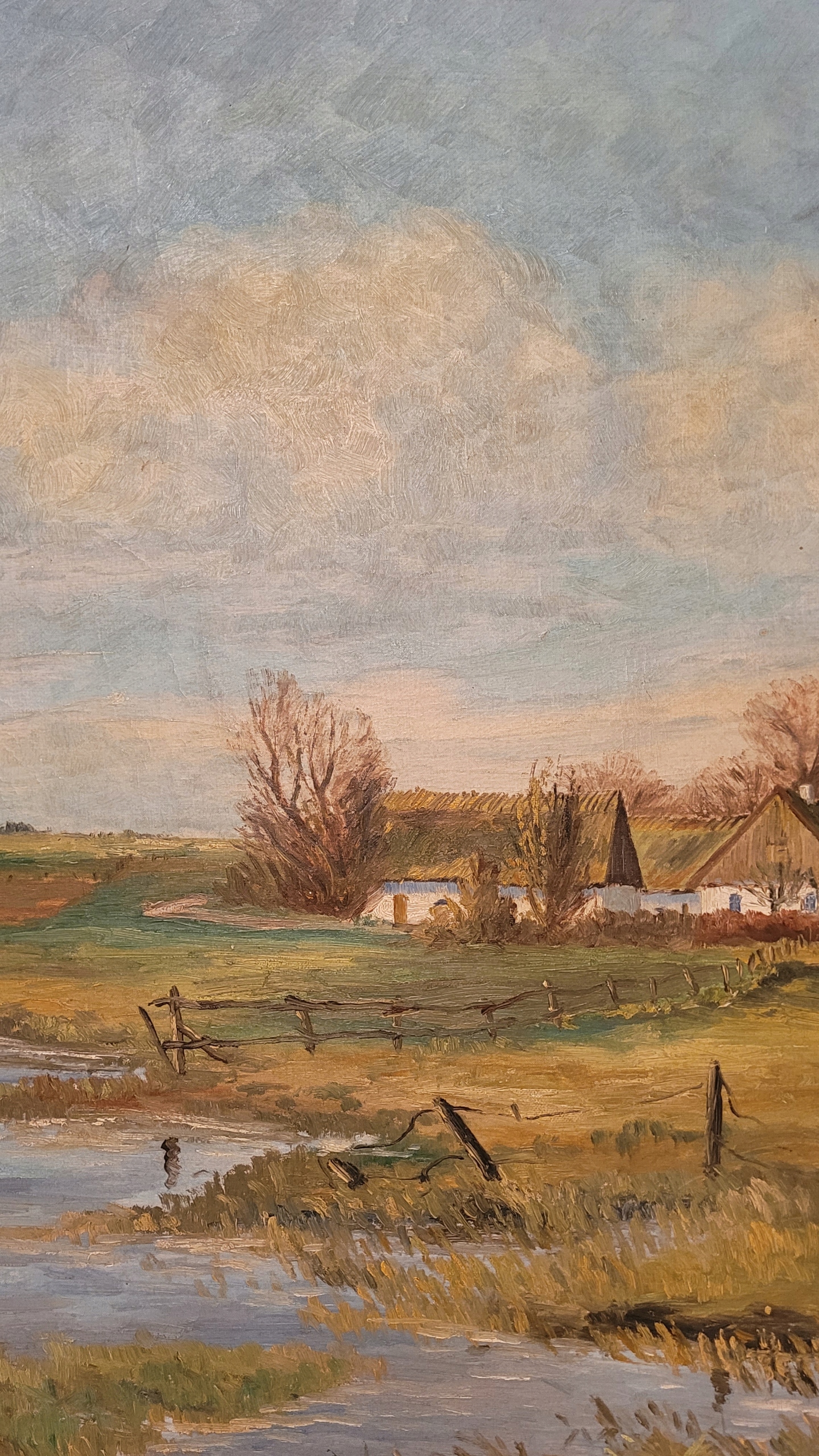ЙОГАННЕС ПЕТЕРСЕН - «СІЛЬСЬКИЙ ПЕЙЗАЖ З МЕРЕДОВИЩЕМ», стара картина маслом.