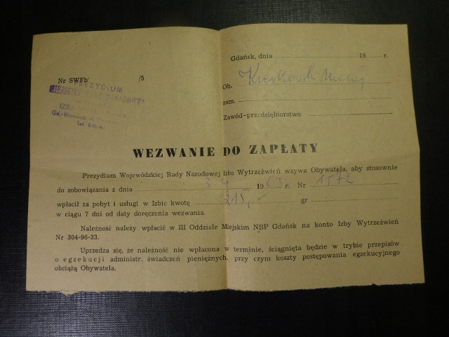 Izba Wytrzeźwień,Gdańsk 1963r.Wezwanie do zapłaty.