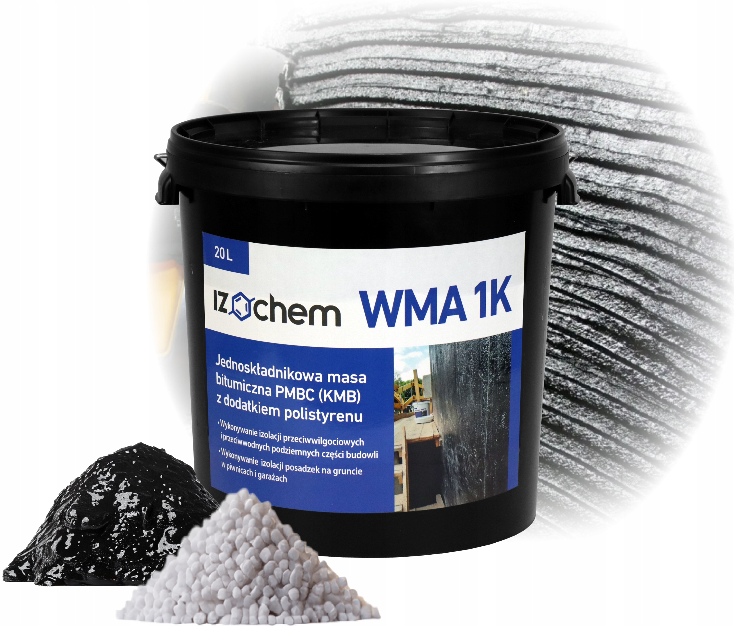 Izochem WMA 1K - однокомпонентна асфальтогумова маса ПМБЦ (КМБ), модифікована полімерами, з додаванням регранулату полістиролу, для гідроізоляції.