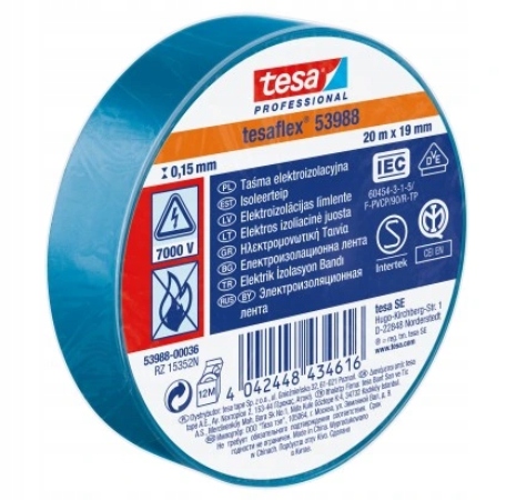 Ізоляційна стрічка Tesa flex 53988 — надійний продукт, призначений для електриків, механіків та інших користувачів. Стрічка має відносно товсту основу та характеризується високим ступенем гнучкості та дуже хорошою ефективністю склеювання (навіть на сталевих поверхнях та при низьких температурах). Ізоляційна стрічка ПВХ підходить не тільки для ізоляції та маркування проводів, а й для ремонту та пакування. Стрічку можна використовувати для маркування, оскільки вона доступна в різних кольорах (червона, синя, коричнева, чорна, біла, сіра, зелена, жовта та жовто-зелена). tesa flex 53988 відповідає всім чинним стандартам і простий у використанні.