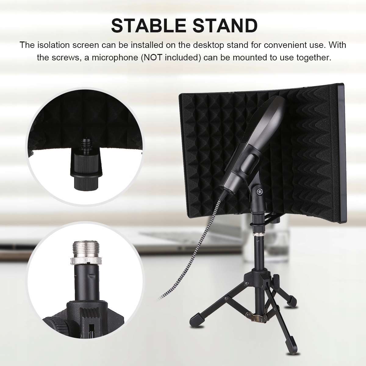 - [Стійка підставка] Ізоляційний екран можна встановити на підставку для комп’ютера для зручного використання. За допомогою гвинтів мікрофон (не входить у комплект) можна з’єднати для спільного використання.