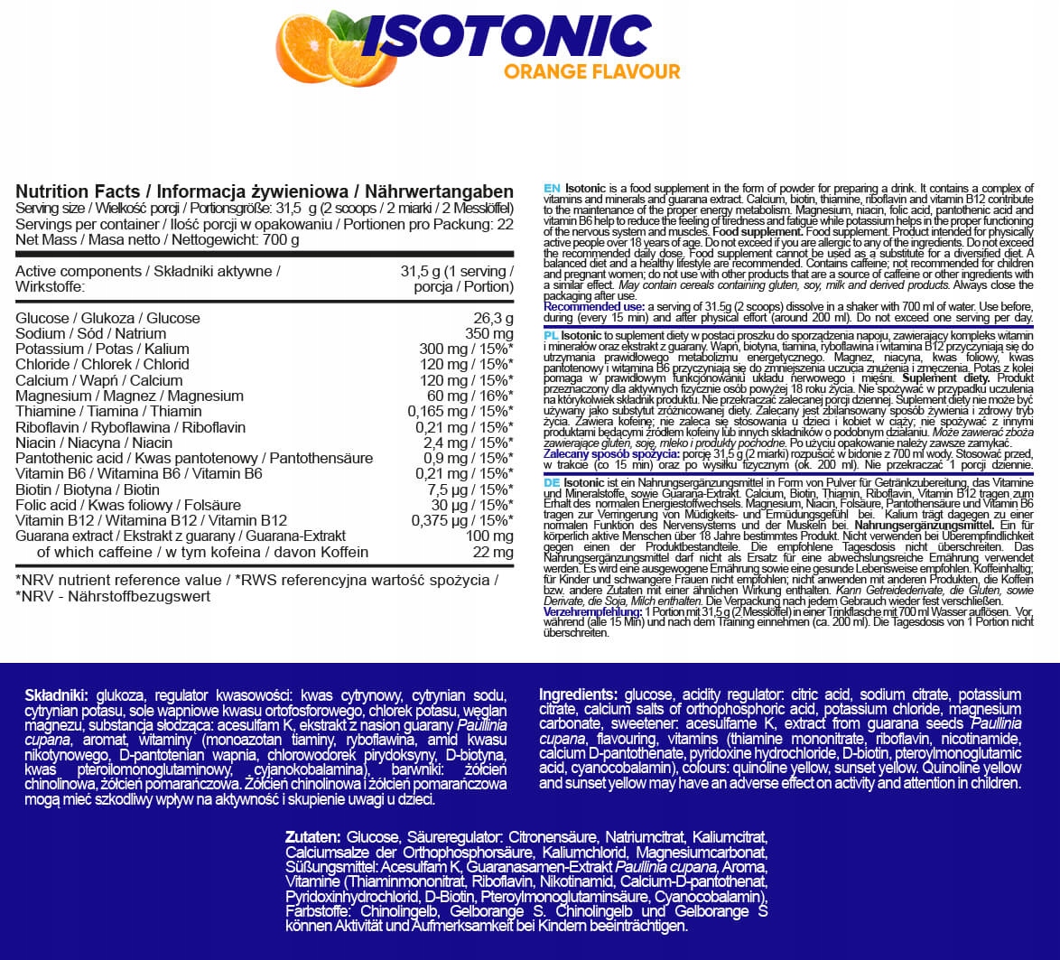 Порошок ізотонічного напою зі смаком апельсина ALLNUTRITION - ISOTONIC - це сучасний концентрат ізотонічного напою, призначений для вживання під час, до або відразу після фізичної активності. Основне його завдання – миттєво заповнити втрату рідини та електролітів. Він також містить енергетичні та функціональні інгредієнти, які можна використовувати під час інтенсивних тренувань або як хороше відновлення після фізичних вправ.