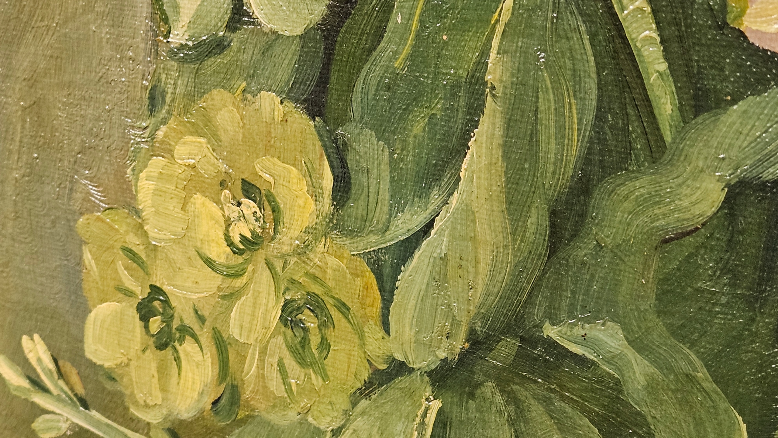 Тема аукціону - це стара велика картина, пофарбована в стиль -імпресіоніст, що зображує нерухоме життя - синю вазу з квітами. На аверсі є підпис автора.