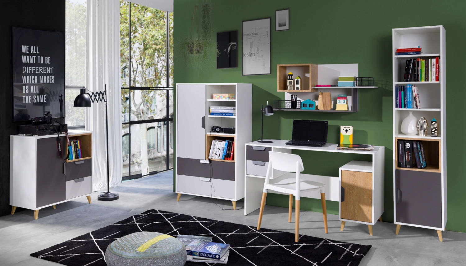 Набір меблів JAŚ, поєднаний у чотирьох модних кольорах: білий + графіт + сірий + дуб левкас. Таке поєднання кольорів радує око. Унікальний зовнішній вигляд меблів змінить будь-яку дитячу чи підліткову кімнату