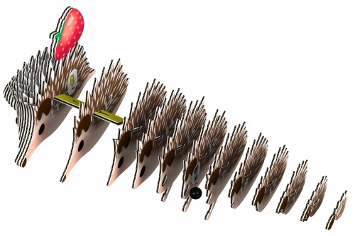 Eugy, розроблені в Новій Зеландії, виготовлені з екологічно чистого переробленого картону та фарби на основі рису. У набір входять пронумеровані частини пазла, нетоксичний клей та інструкція зі створення милого їжачка з солодкою полуницею на спині.