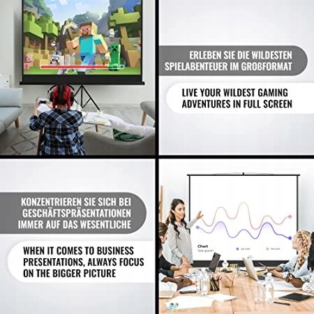 Екран має діагональ приблизно 85 дюймів, тобто приблизно 215 сантиметрів. Міцна металева підставка з пластиковими ніжками забезпечує стійкість і протиковзкі властивості. Навантажувальна балка запобігає неприємним складкам. Тришарова тканина легко чиститься завдяки вініловому покриттю.
