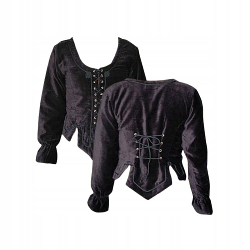 Піджак виготовлений з щільного оксамиту. Перед, рукави та краї оздоблені шнурком. Ширину талії можна регулювати за допомогою шнурка ззаду. Всередині бавовняна підкладка. Доступний колір ЧЕРВОНИЙ.