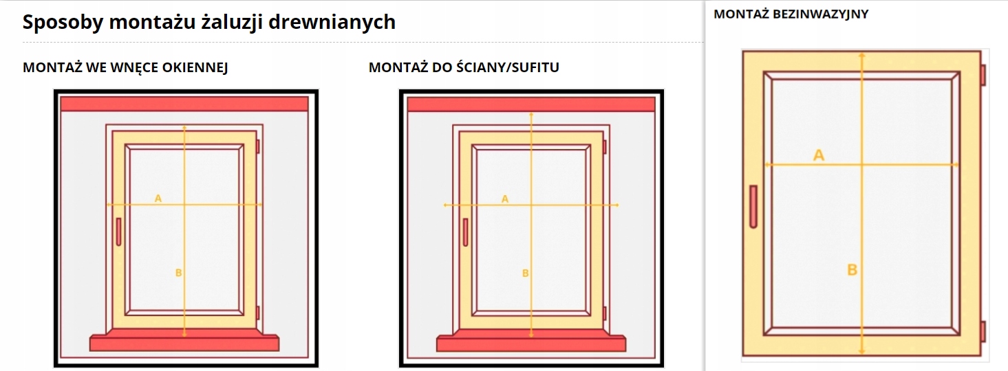 Ширина A = ширина віконної ніші мінус 1 см. для компенсації нерівності виїмки та ефекту застрявання жалюзі. Ми рекомендуємо знімати мірку в 3 місцях, а ширина найвужчого з цих розмірів - 1 см. У разі установки в ніші, варто зазначити, що решітка повинна бути підготовлена без бічних панелей.