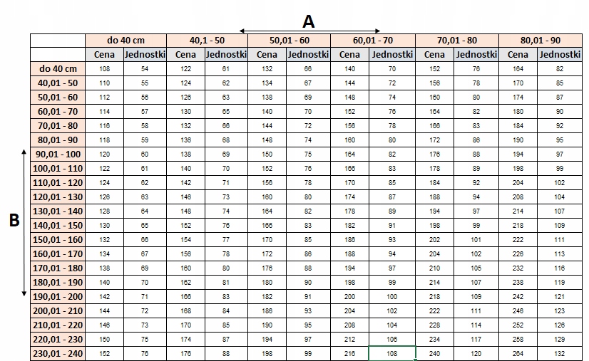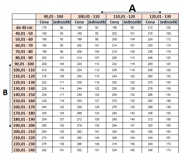 Приклад для плісе з розмірами: 50 см x 110,1 см (70 штук, згідно з таблицею нижче)