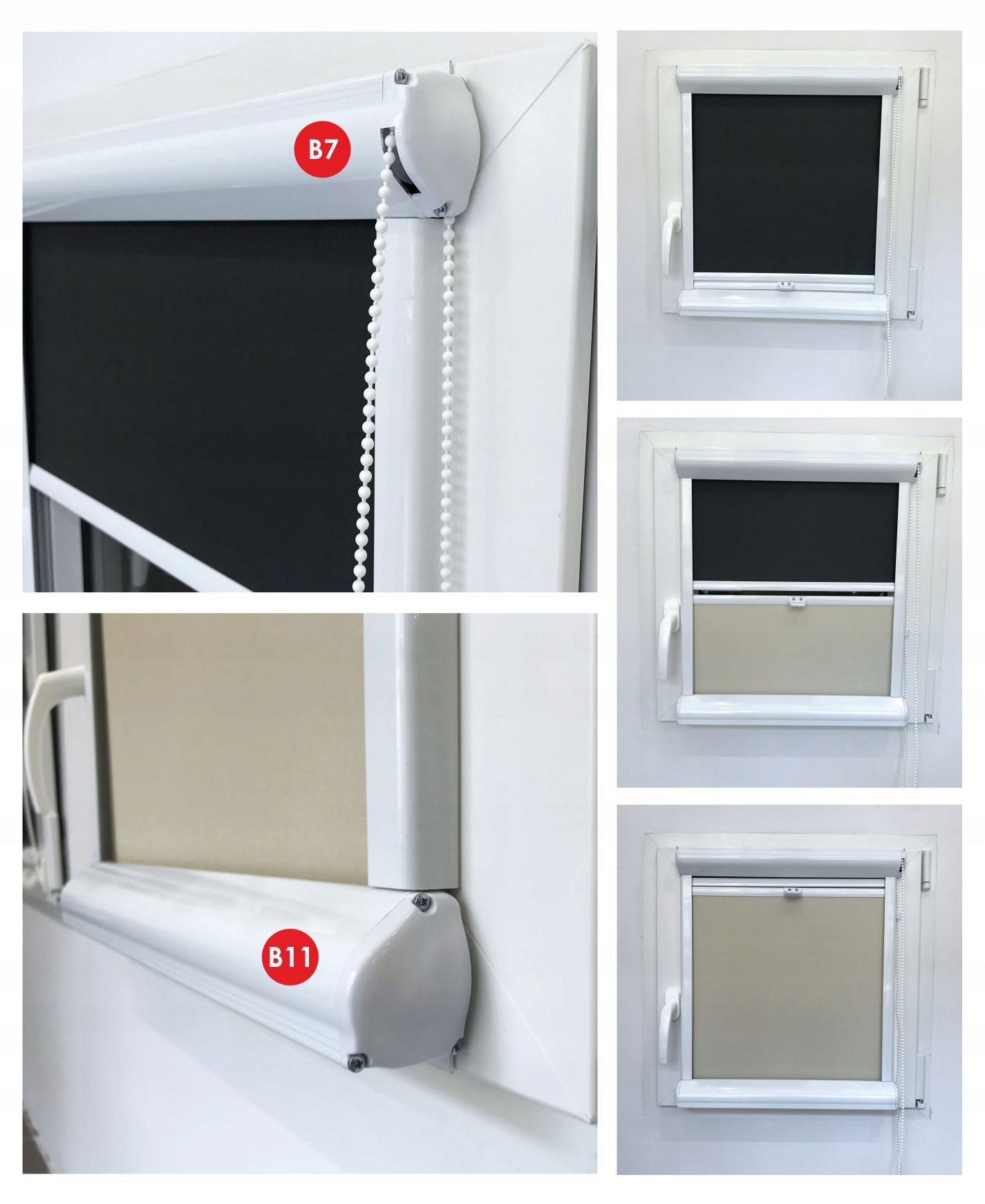 У випадку системи Bamar 11 можна з'єднати дві рулонні штори на одному вікні за допомогою одного набору напрямних як на фото нижче. Верхня рулонна штора може бути з ланцюговим механізмом в алюмінієвій касеті (В7) або з пружинним механізмом (В11), нижня рулонна штора ТІЛЬКИ з пружинним механізмом ( B11).