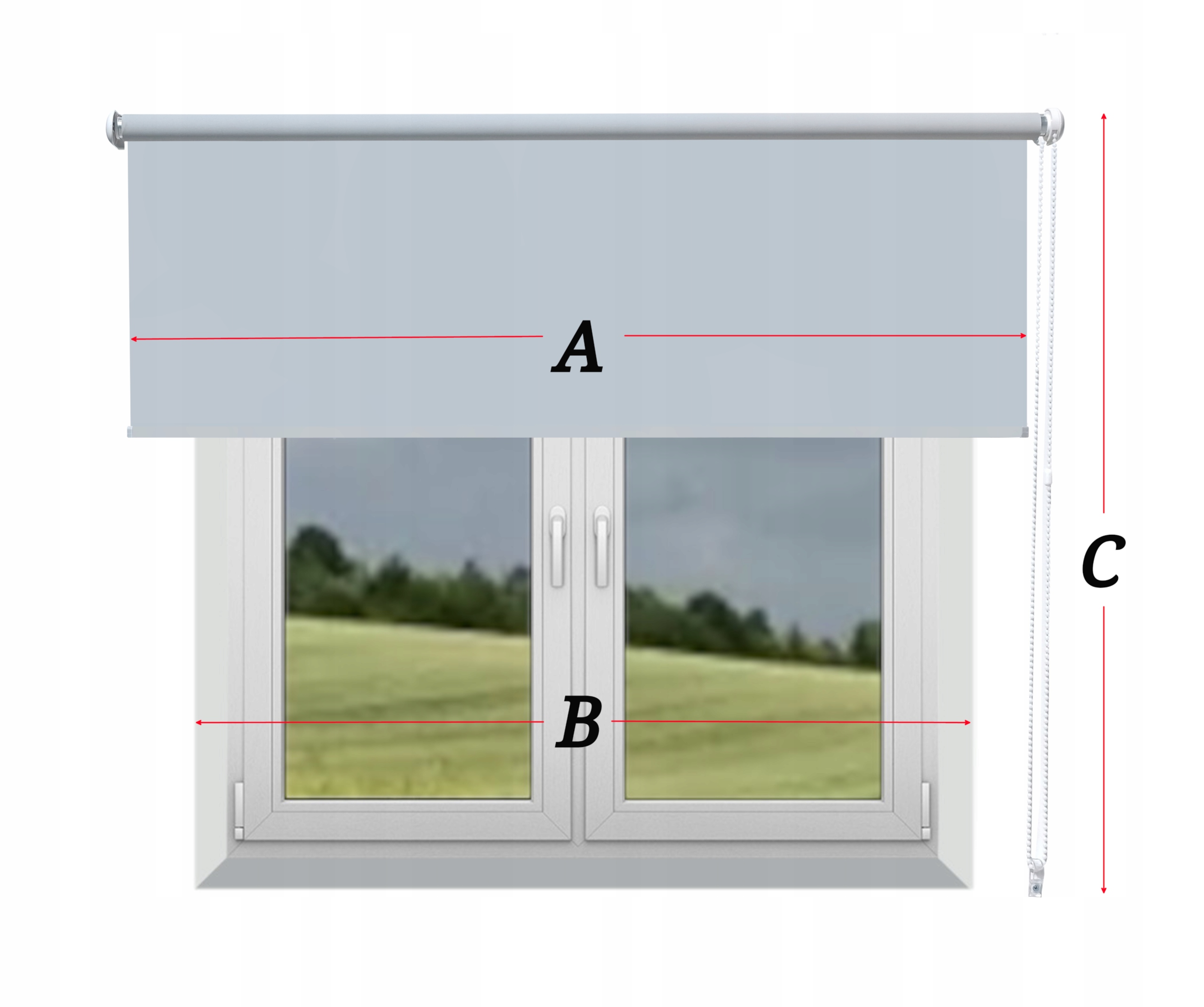 - Щоб визначити розмір A – тобто ширину рулонної штори, спочатку потрібно виміряти ширину віконної ніші. Потім до отриманого результату додайте від 10 см до 20 см.