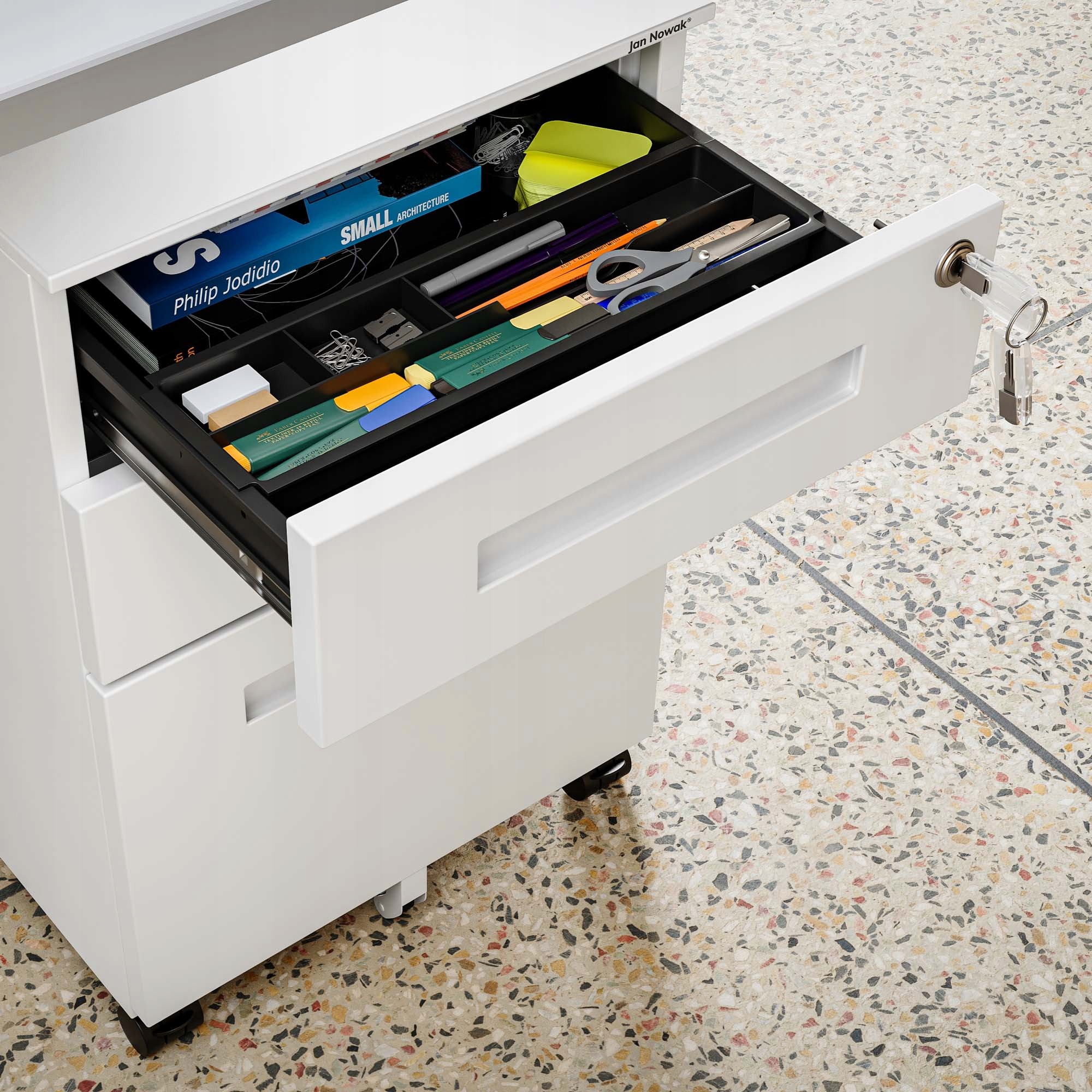 Два верхніх ящиків (висота 119 мм) - це чудово, як місце для найбільш необхідних речей, а спеціальні вставки допомагають організувати офісні аксесуари (ручки, паперові кліпи, ножиці, марки тощо).