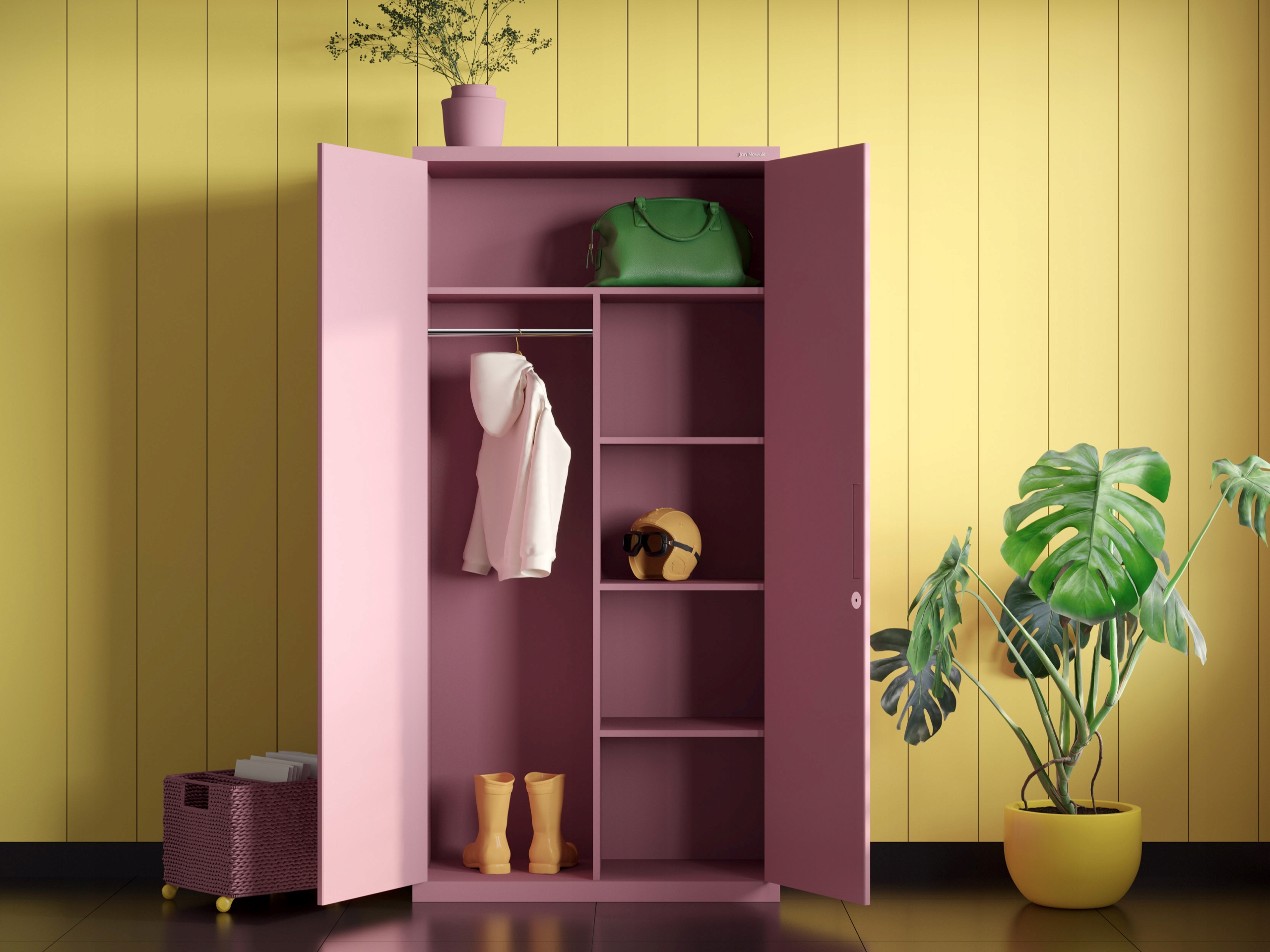 Ми поєднали практичність з унікальним зовнішнім виглядом, створивши допоміжну шафу DAWID у відтінку пудрово-рожевого, який неможливо ігнорувати. За дверцятами, що замикаються, є просторі ніші, полиці та вішалка для одягу. Продуманий інтер'єр забезпечить в ньому завжди бездоганний порядок. Однак рівномірно нанесена фарба ніжного рожевого кольору перетворює функціональний предмет меблів на привабливий дизайнерський акцент.