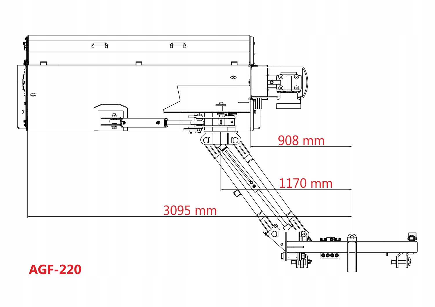 Модель AGF-220 має ширину зрізу 218 см і приводиться в рух карданним валом, що входить до комплекту постачання. Косарку можна рухати ліворуч і праворуч і нахиляти (вгору на 90° і вниз на 55°). Для роботи цих функцій потрібні 2 гідравлічні контури керування трактором, оскільки косарка обладнана 2 гідроциліндрами подвійної дії.