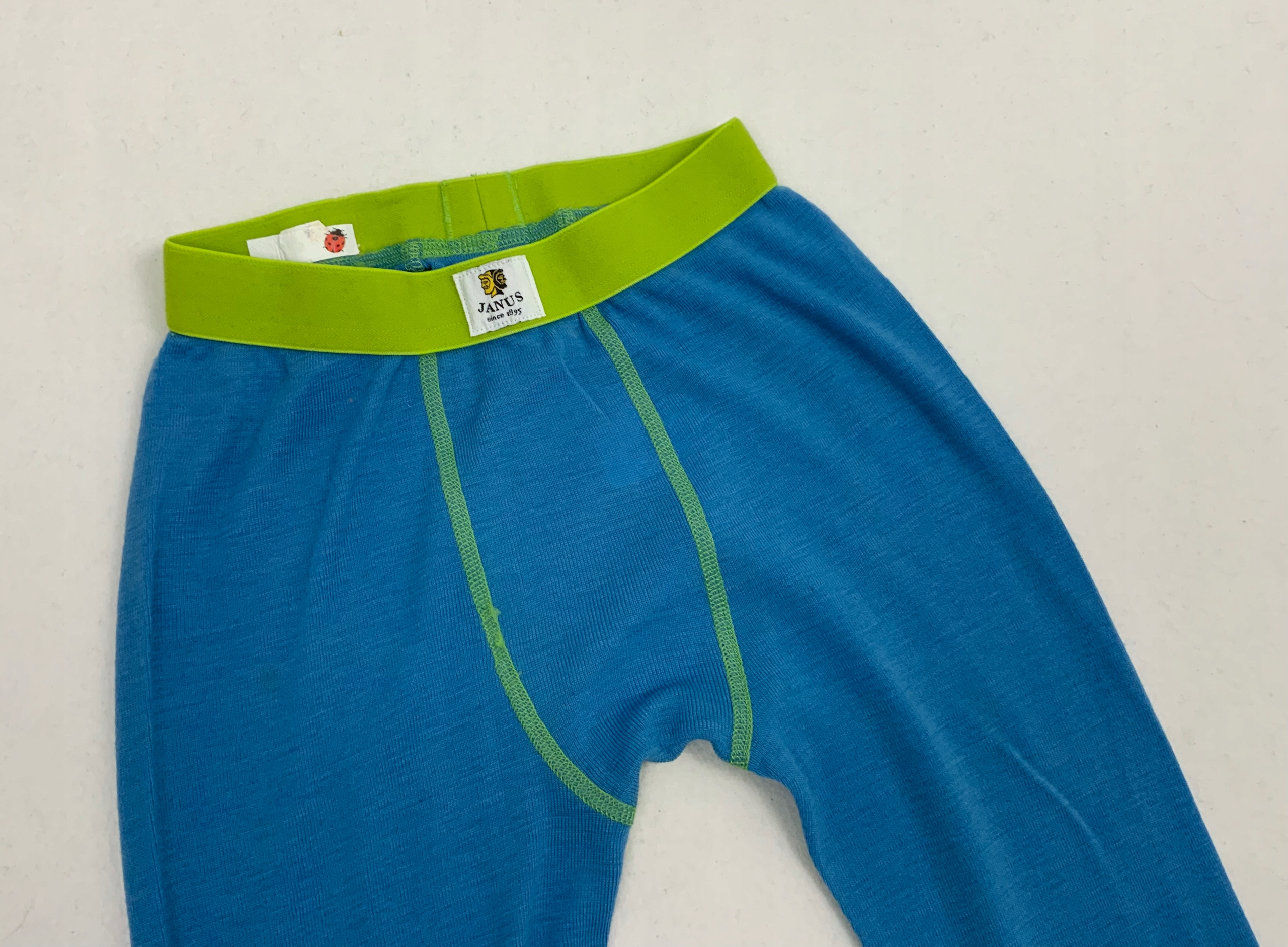 Сині легінси. Зовнішні сторони ніжок безшовні, інші шви плоскі, світло-зелені. Штанини оброблені манжетами. Еластичний пояс