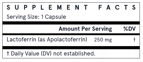 Кожна капсула містить 250 мг лактоферину (аполактоферину), який є важливим глікопротеїном. підтримка імунної системи. Він природним чином міститься в грудному молоці, сльозах та інших рідинах організму. Однією з біологічних властивостей лактоферину є його сильна здатність зв’язувати залізо (у 300 разів більша, ніж у сироваткового трансферину). Завдяки цьому він не тільки покращує засвоєння заліза організмом, а й сприяє росту корисних бактерій у травній системі. Крім того, перетравлення лактоферину шлунковим пепсином вивільняє пептид лактоферину В.