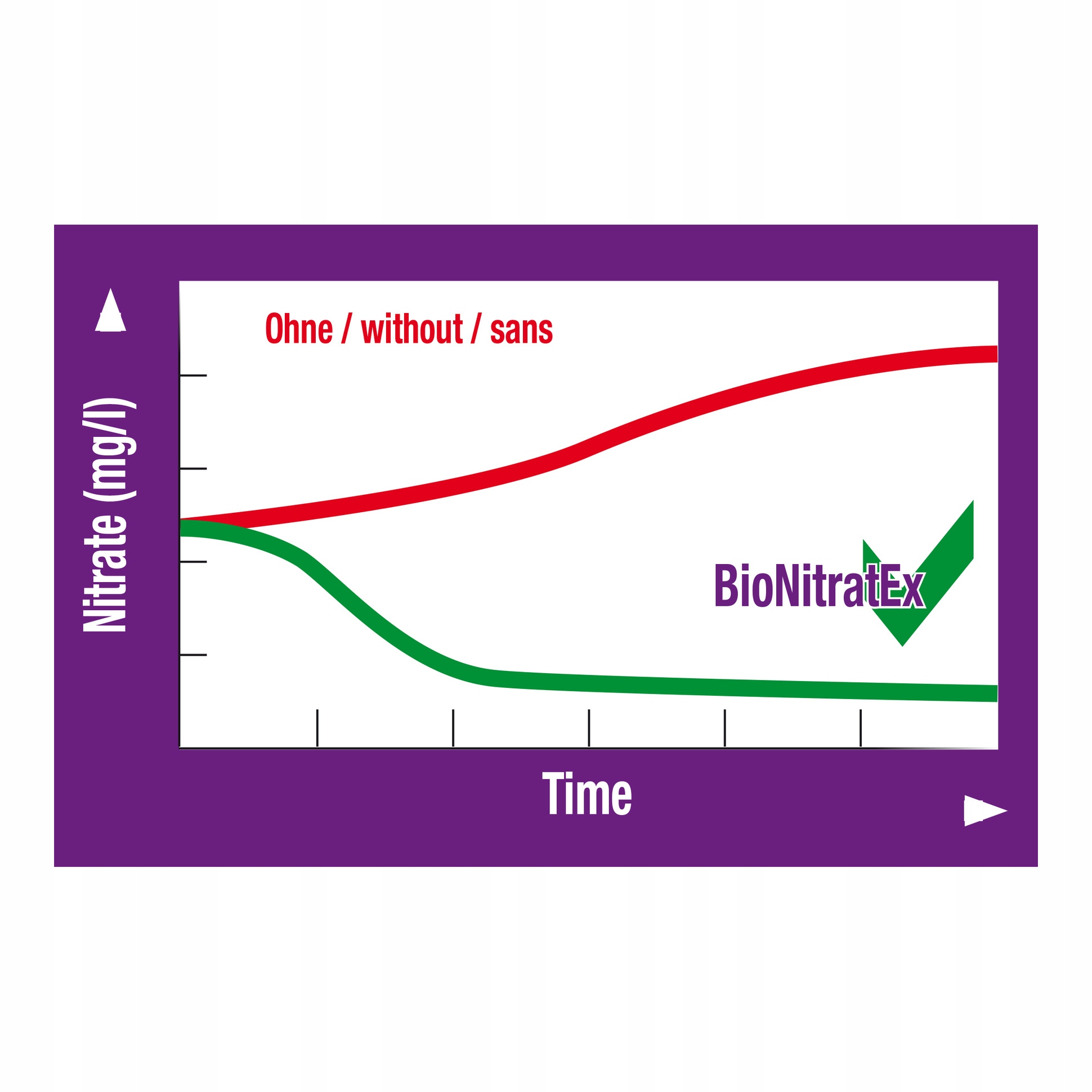 У випадку JBL Bionitratex, бактерії осідають протягом 4 тижнів на поверхні кульок і утворюють товсту біоплівку. За біоплівкою в кисні утворюється погана зона, в якій бактерії потім переходять до "денітрифікації" і розбивають нітрати (NO3), що сприяє розвитку водоростей. Біологічні кульки служать їжею та нітратами як постачальник кисню для бактерій. Тому біологічні кульки зменшуються з часом (простий візуальний контроль) і повністю зникають. Це триває близько 6-12 місяців, залежно від навантаження на нітрат. Тоді вам потрібно знову поповнити біологічні кульки.