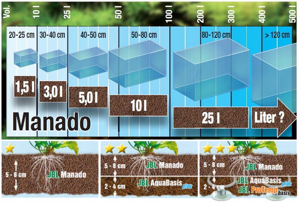Ще одна важлива особливість — повна безпека для донних риб та їхніх тонких сенсорних вусиків, коли вони шукають їжу в субстраті. Рекомендується використовувати JBL Manado у поєднанні з JBL AquaBasis у нижній частині як джерело поживних речовин для рослин.