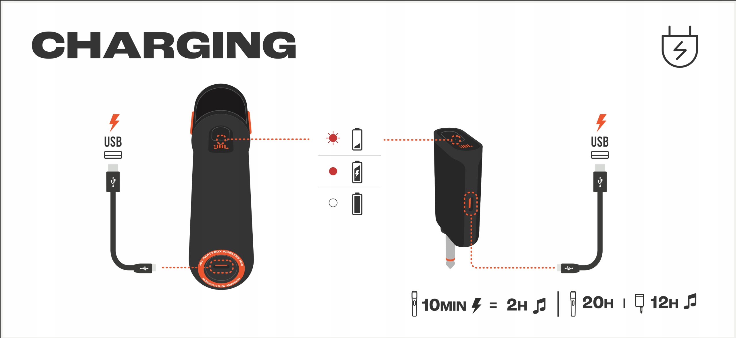 Якщо батарея мікрофона розрядиться, просто підключіть мікрофон до зарядного порту JBL PartyBox.