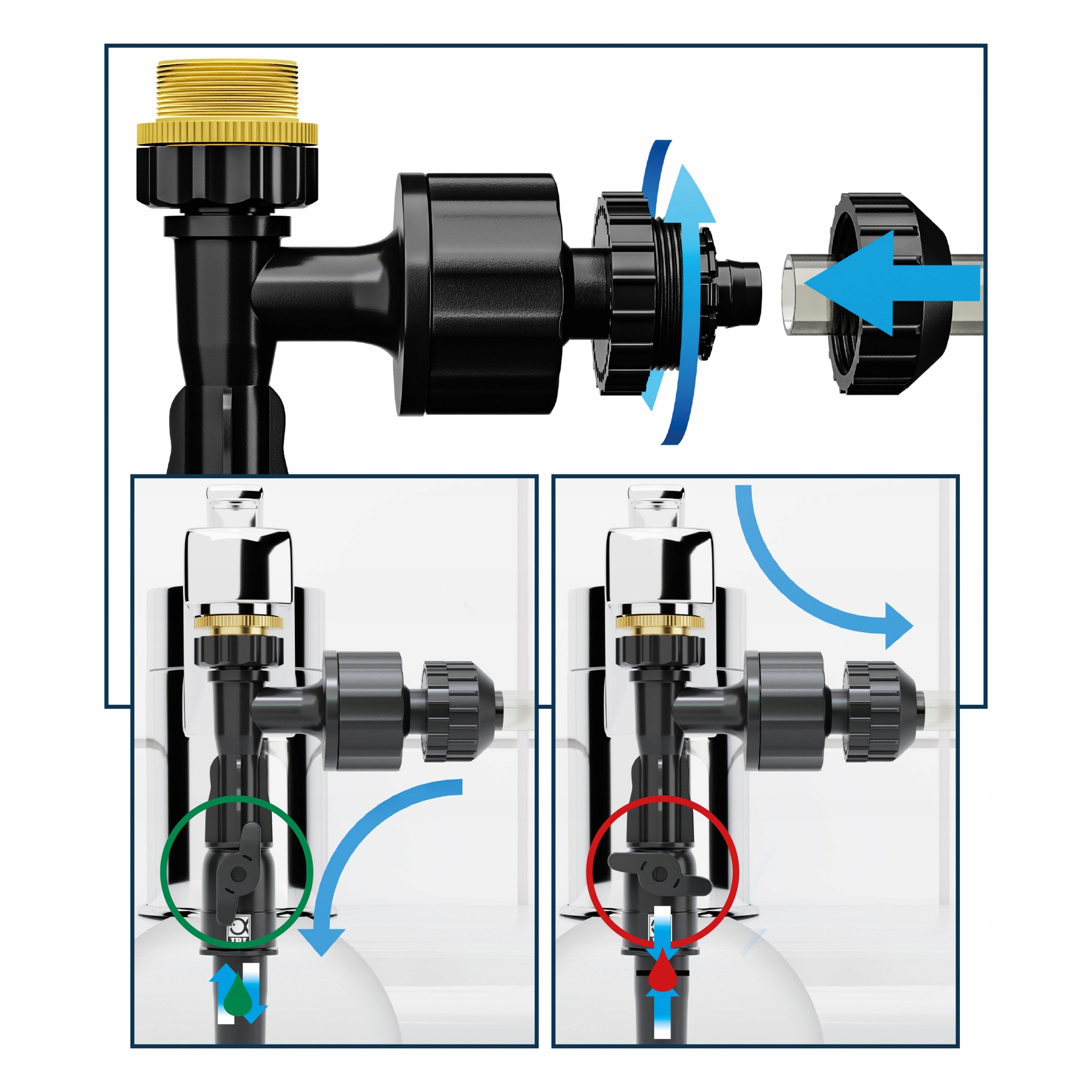 Накрутіть жиклер на кран, підключіть шланг, відкрутіть кран і за допомогою важеля виберіть, всмоктувати воду чи наповнювати водою акваріум