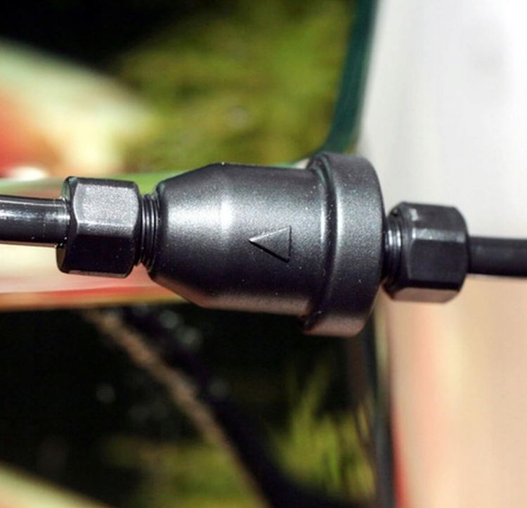 Цей маленький пристрій дуже легко зібрати. Просто відріжте шланг CO2 і вставте зворотний клапан. Стрілка на клапані чітко показує напрямок установки. На відміну від скляних клапанів JBL Proflora CO2, Tajfun Safestop має дві запобіжні гайки, які запобігають випадковому від'єднанню шланга від клапана. З'єднувачі підходять до всіх шлангів діаметром 4/6 мм