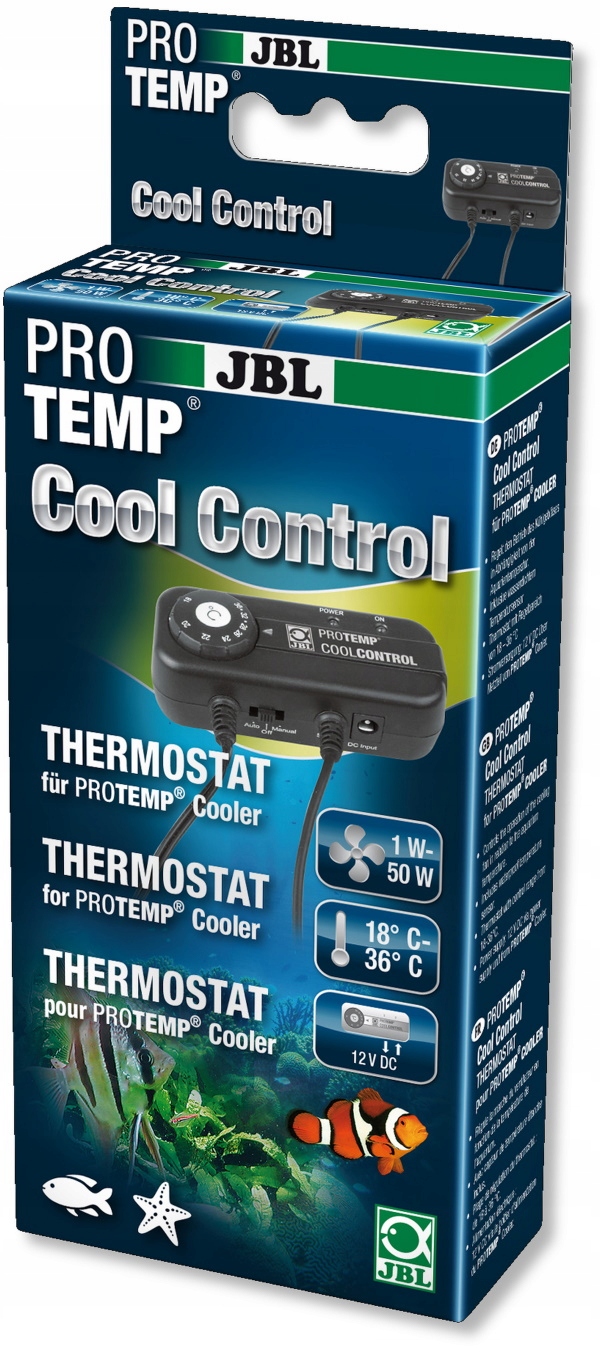 Термостат для керування вентиляторами JBL ProTemp для акваріумів. Він забезпечує автоматичне ввімкнення охолоджуючого вентилятора при перевищенні заданої температури в діапазоні від 18 до 36 °C. Сумісний з усіма моделями JBL ProTemp Cooler.