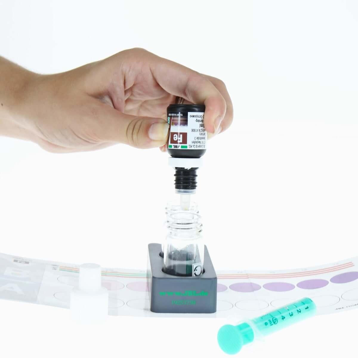 Набір JBL ProAquaTest включає: реагент, кольорову шкалу, яку легко читати, шприц, 2 пробірки з ковпачками, тримач для пробірок та інструкції з вимірювання . Лише кілька простих кроків і за короткий час ми зчитаємо результат тесту з кольорової шкали. Тест дозволяє визначити вміст заліза в діапазоні від 0,2 до 1,5 мг/л.