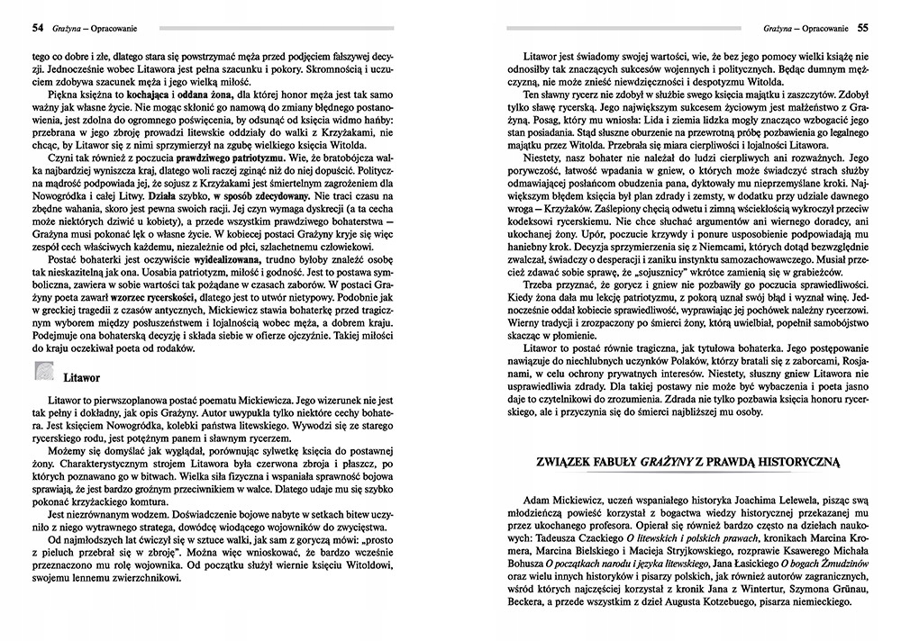 Видання Grażyna повне без будь-яких скорочень чи скорочень у змісті. У цьому виданні ви знайдете відповіді на запитання з підручника – «напевне в тесті», тобто вказівку на питання, які зазвичай зустрічаються в питаннях із даної літератури в усіх перевірках знань, а також у підручниках і класних контрольних роботах. Книга містить повний текст для читання. Наприкінці книги є дослідження з дуже докладним резюме та ще одним коротким, що полегшує швидку підготовку до уроку. Дослідження також містить план подій, ретельно висвітлену проблему та широкі характеристики героїв.