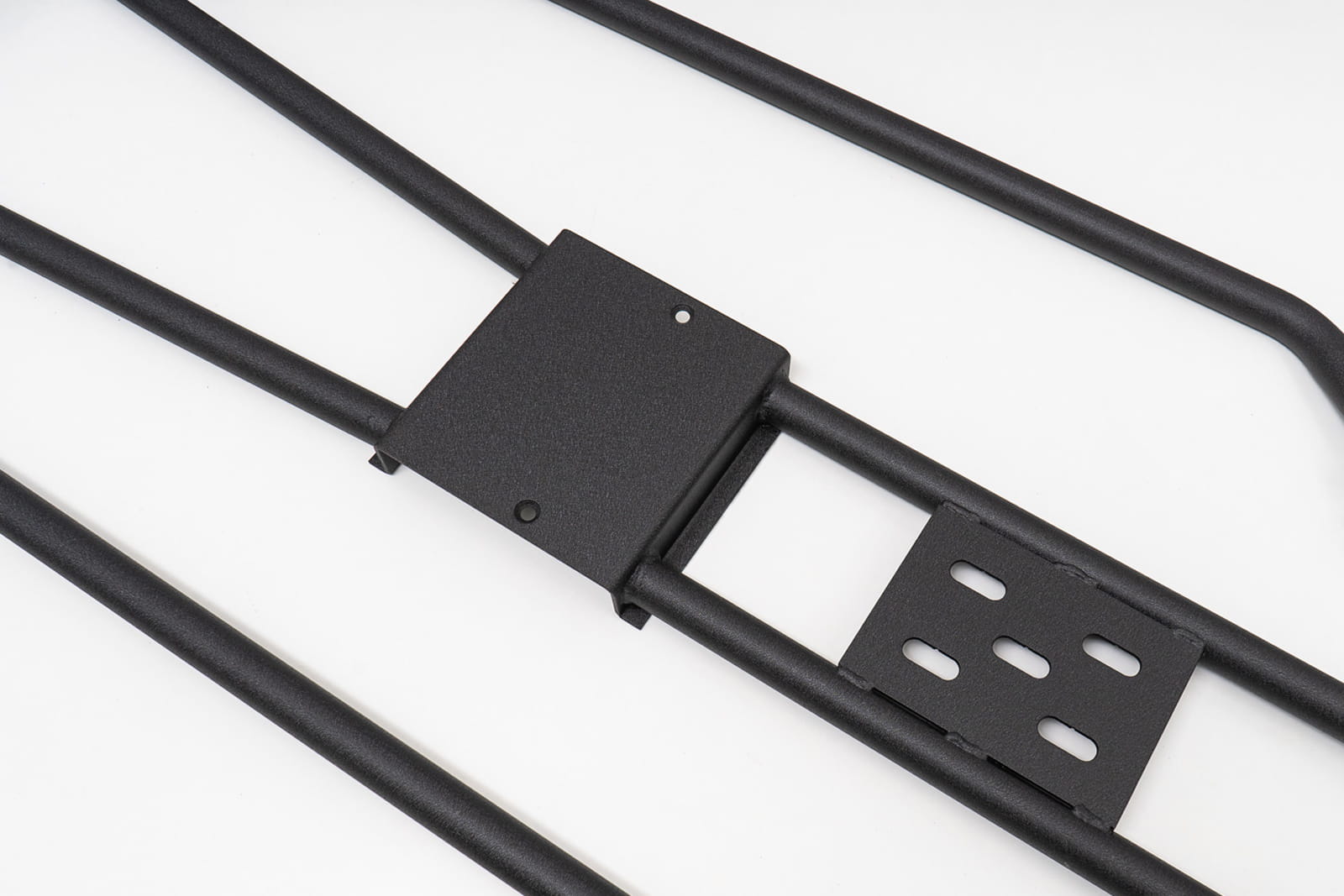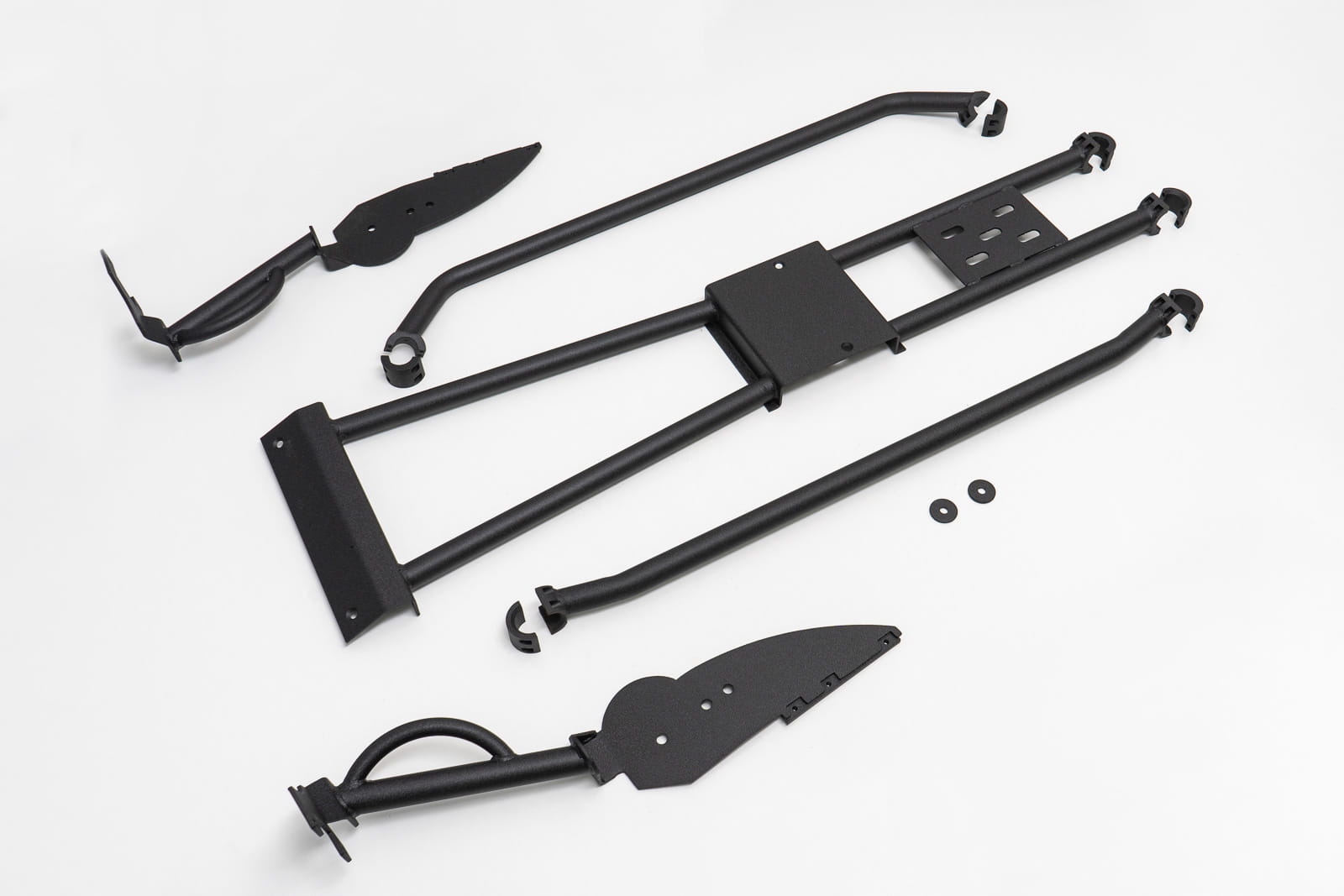Клітка кріпиться до прутків заводського SOFT TOP завдяки трубчастим стрижнетримачам. Виріб виготовляється з холоднокатаної сталі та труб. Усе було захищено двоетапним процесом порошкового покриття з використанням епоксидного попереднього шару, що створило міцну чорну структуру з текстурою TIGER.