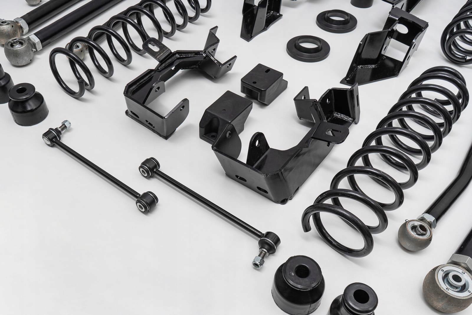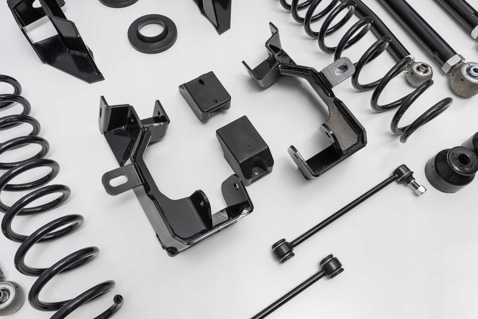 Ще одним елементом набору є пружини, розроблені спеціально для моделі JEEP WRANGLER JK. Виготовлений з високоякісної сталі, пофарбованої в чорний колір. Вони працюватимуть у будь-яких умовах, незалежно від типу місцевості та типу використання. Крім того, в набір входять всі необхідні елементи для підйому підвіски нашого Wrangler, в тому числі: набір регульованих поперечних важелів, тяг стабілізаторів і бамперів.