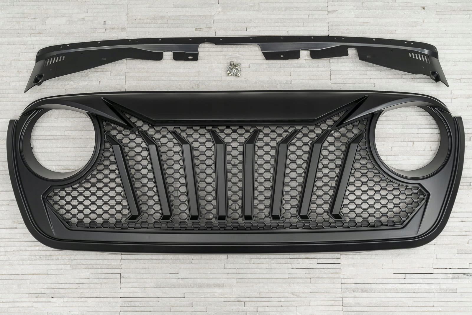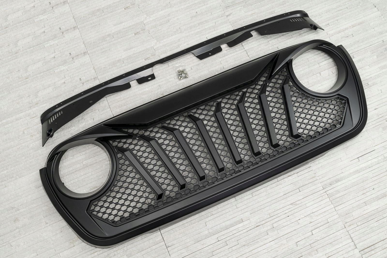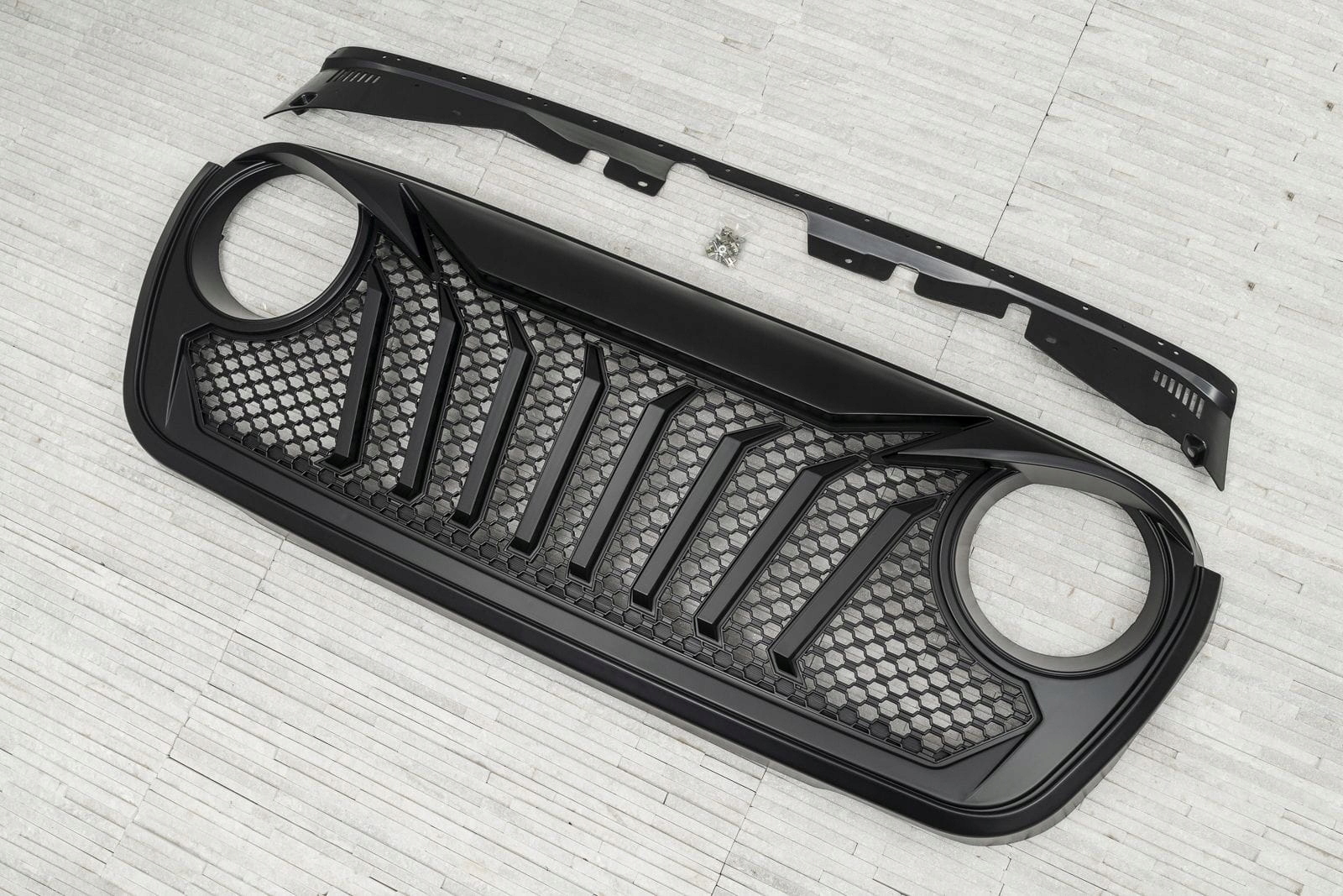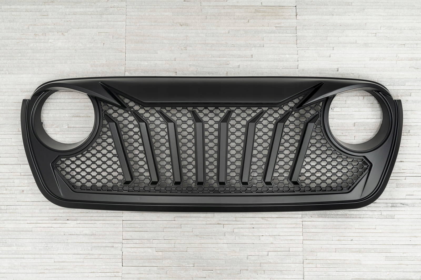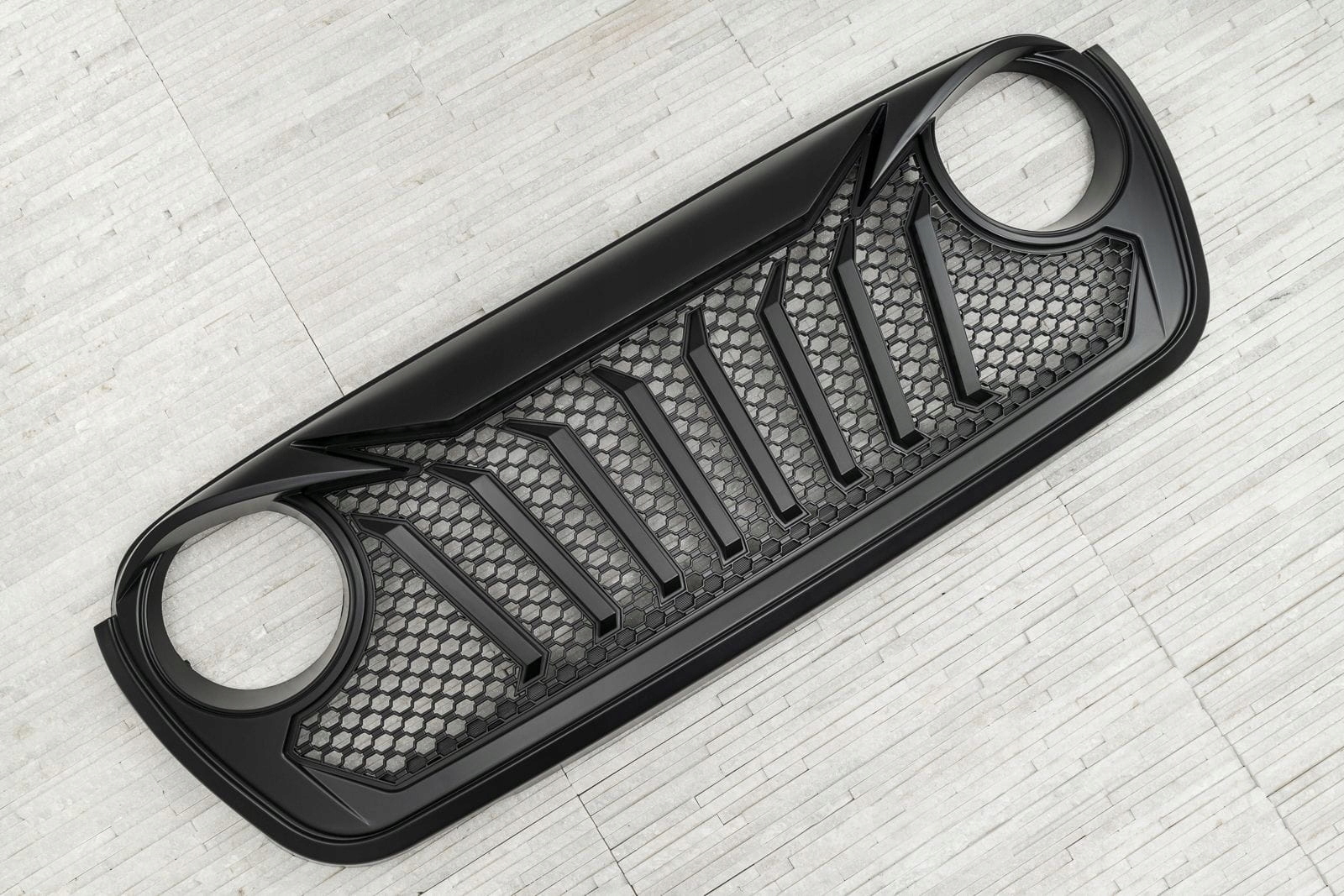 Виділений гриль був розроблений для повного зміни стилю Wrangler. Динамічні, косі лінії підкреслюють отвори світильників, додавши передні світи глибини та вертикальні підкріплення на тлі щільної, виразної решітки решітки, підкреслюють спортивний, агресивний характер елемента. Ціле-ідеальна композиція для підкреслення позашляхової душі автомобіля.