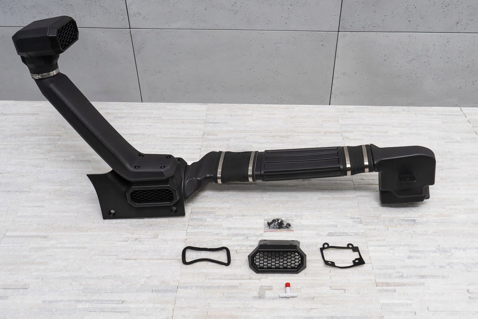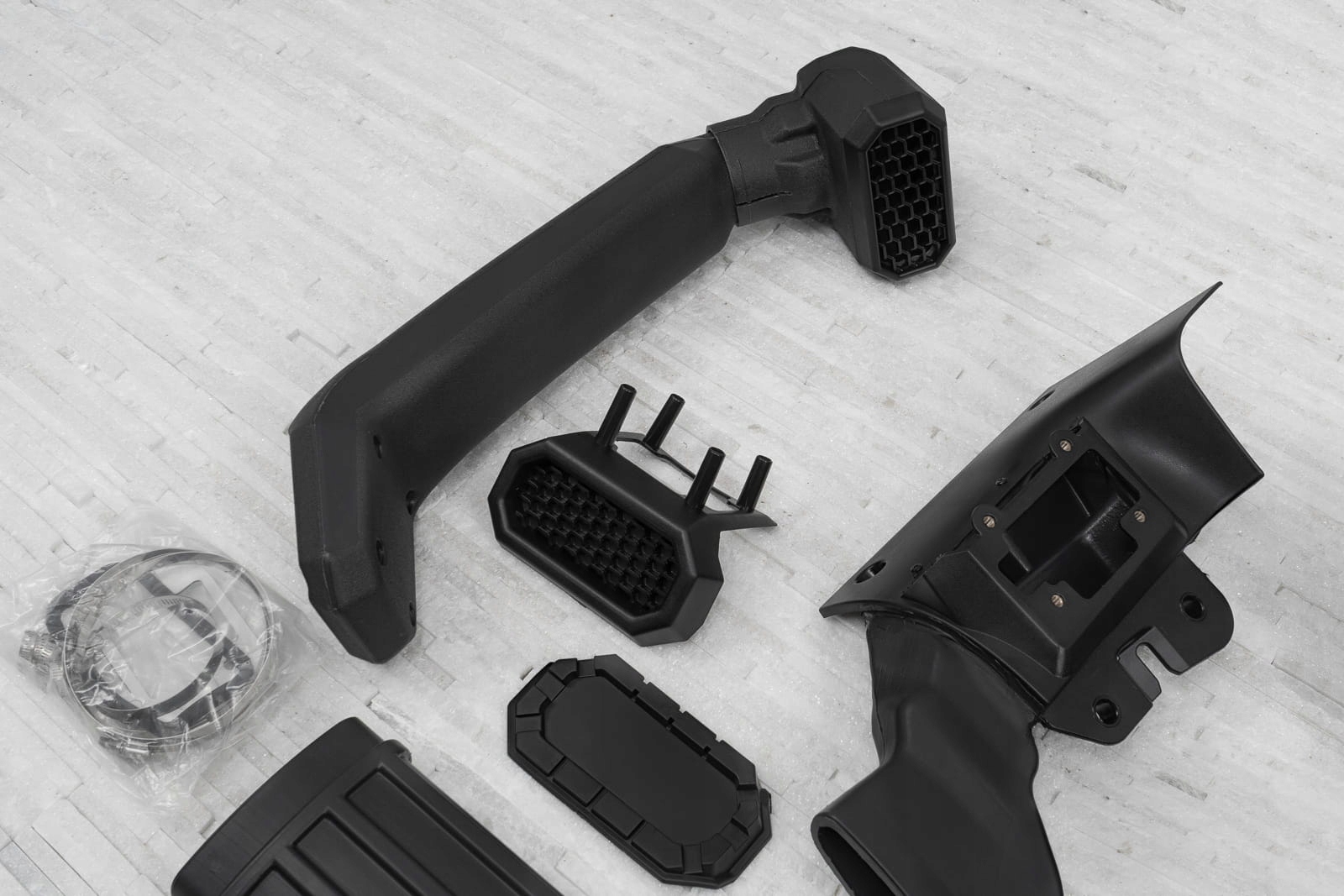 Для встановлення трубки не потрібно свердлити отвори в масці! У комплект входять два види повітрозабірників - довгий і короткий, а також всі необхідні складальні деталі. Ми рекомендуємо установку в професійній майстерні.
