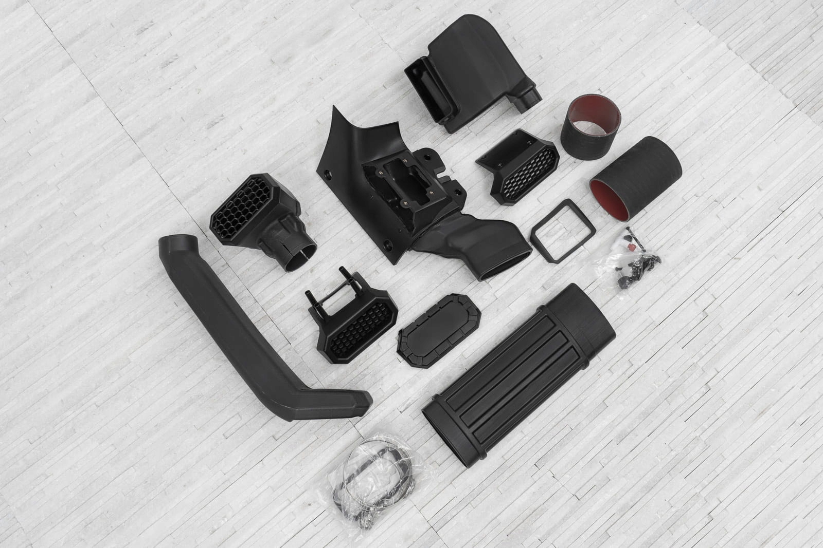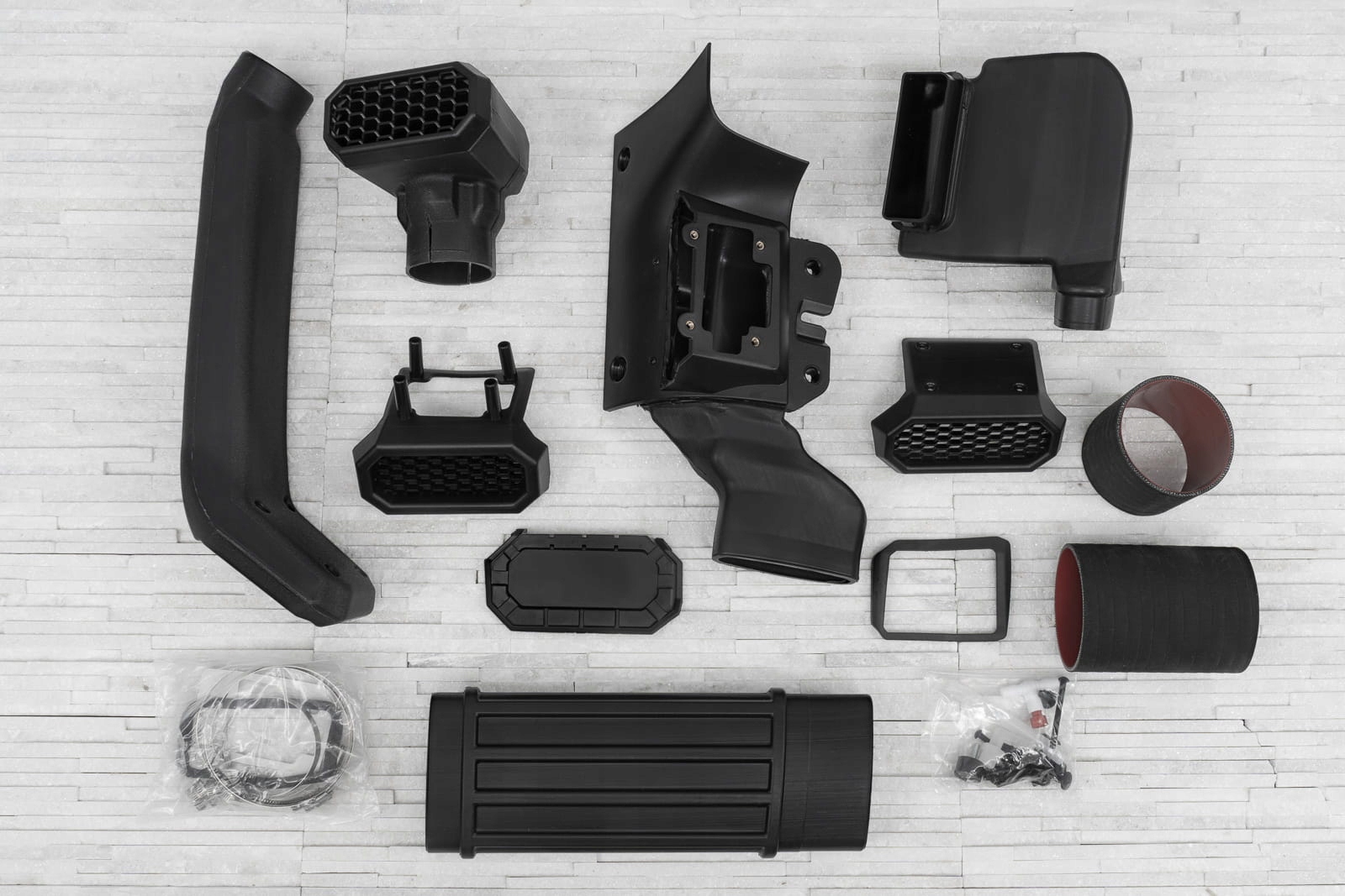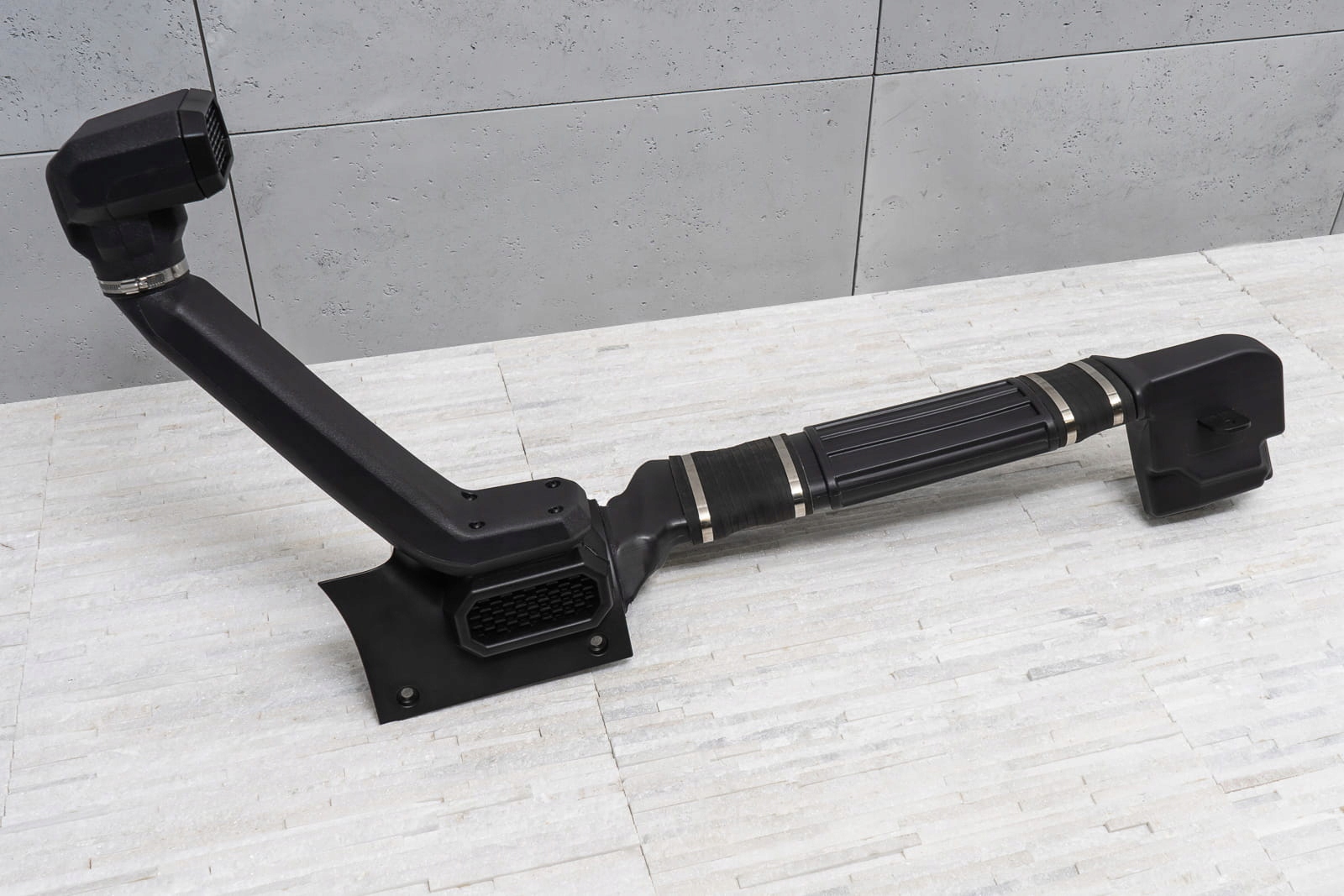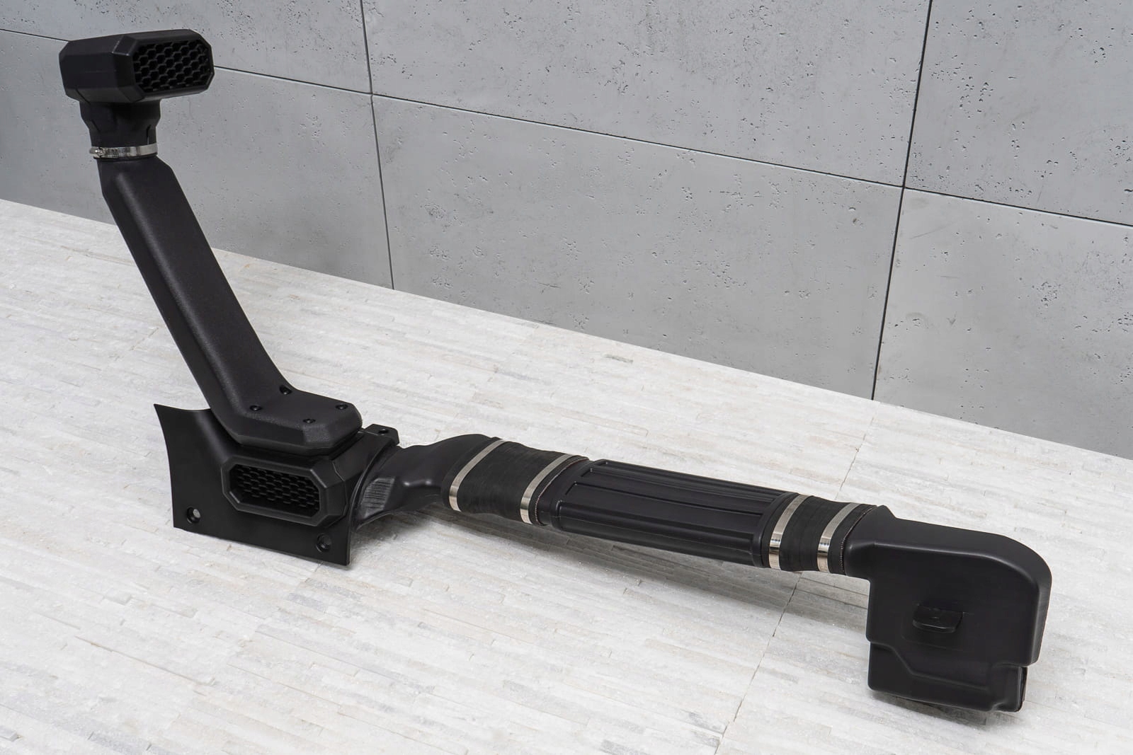 Пропонований продукт характеризується інноваційною модульною структурою, яка дозволяє змінювати висоту входу повітря. Спеціально розроблена основа козирка дозволяє легко змінити повітрозабірник зі стандартної високої трубки на низький, розташований трохи вище капота. Це не тільки знижує ризик залиття двигуна водою, але і зменшує кількість пилу і пилу, що потрапляє в повітряний фільтр. Після встановлення шноркель не заважає складати лобове скло чи демонтувати двері.