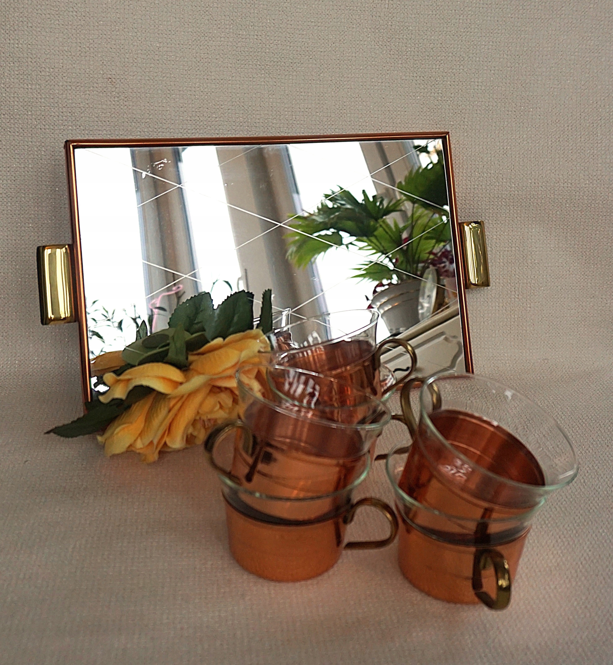 Сьогодні я рекомендую вражаючий набір з шести склянок, обрамлений металевими кошиками з ручкою. Лоток з дзеркальною поверхнею.