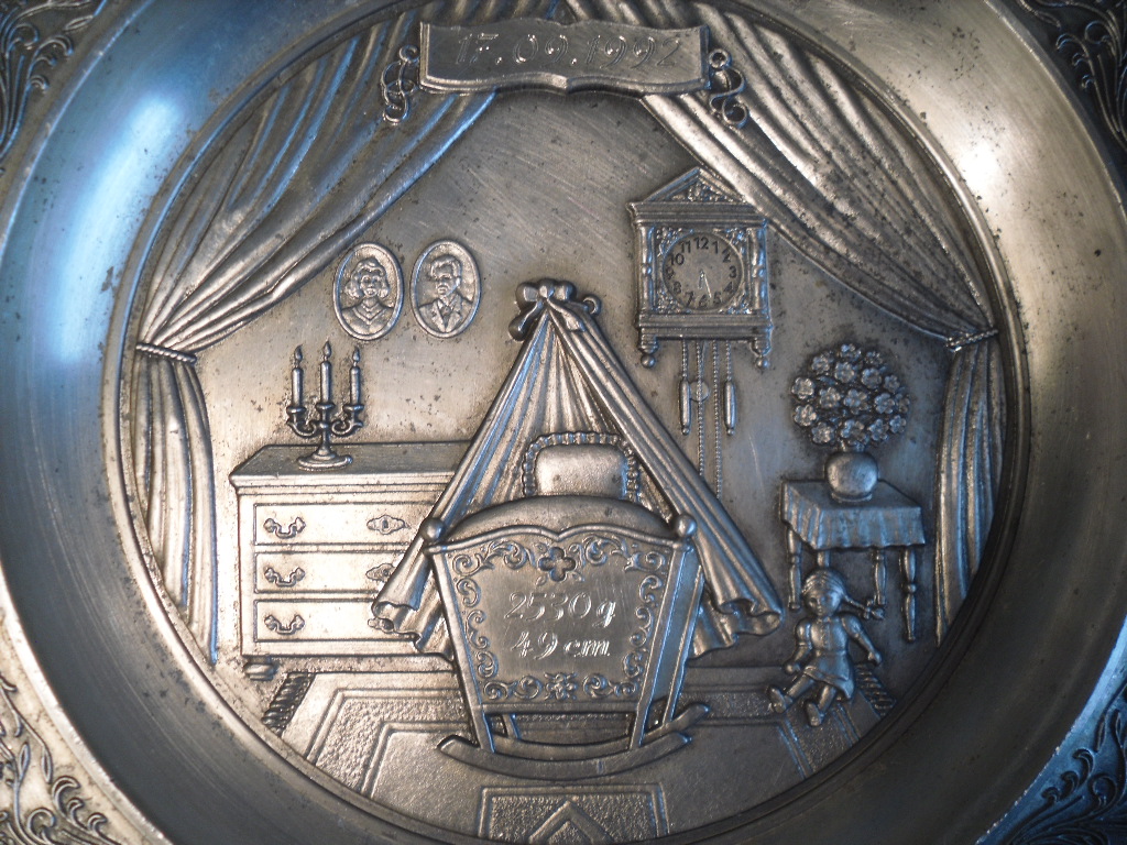 Жерсть, стара декоративна тарілка, сувенір на день народження дитини, 1992 р., жерсть