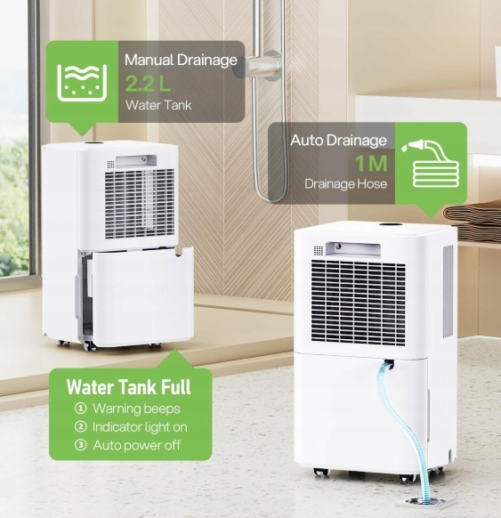 - 2 варіанти дренажу та резервуар для води об’ємом 2,2 л – автоматичний дренаж: використовуйте 1-метровий шланг із комплекту для легкого та безперервного спорожнення. Злив вручну: наш осушувач оснащений знімним резервуаром для води великої місткості 2,2 л. Коли резервуар заповнюється, пристрій попереджає та автоматично вимикається, доки резервуар не спустошиться та не переміститься, щоб запобігти переповненню.
