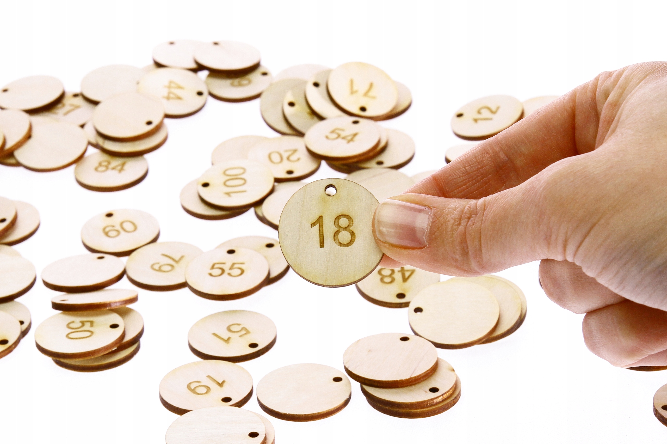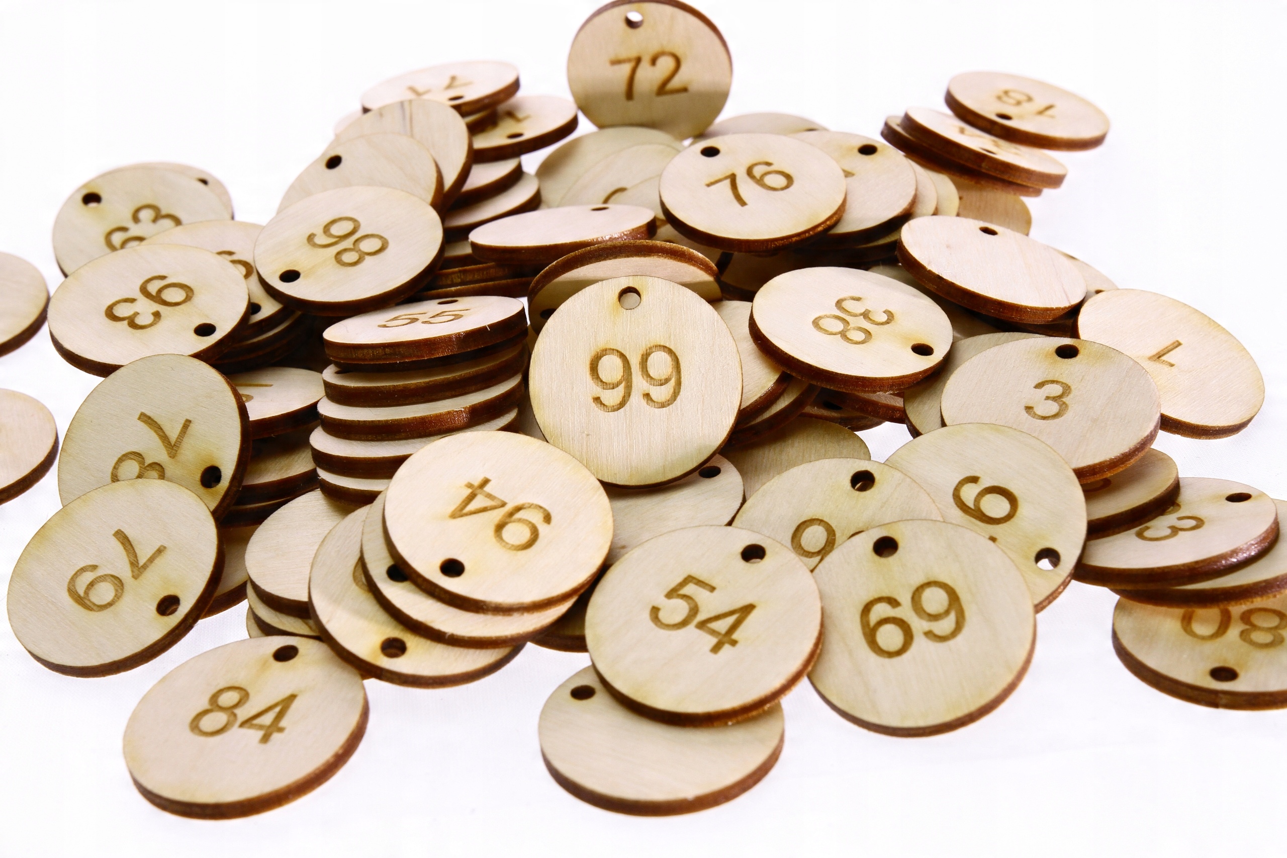 Дерев'яні жетони діаметром 3 см із вигравіруваним числом від 1 до 100.
