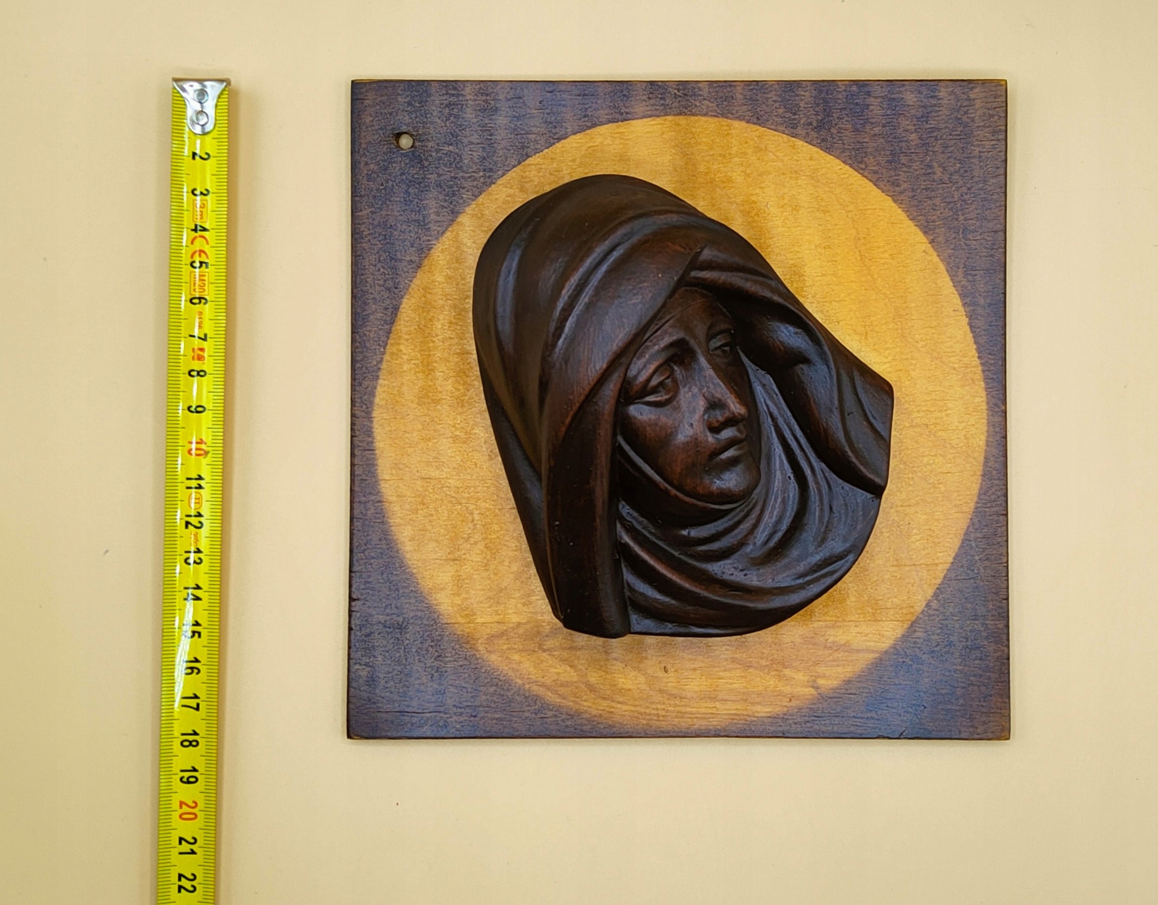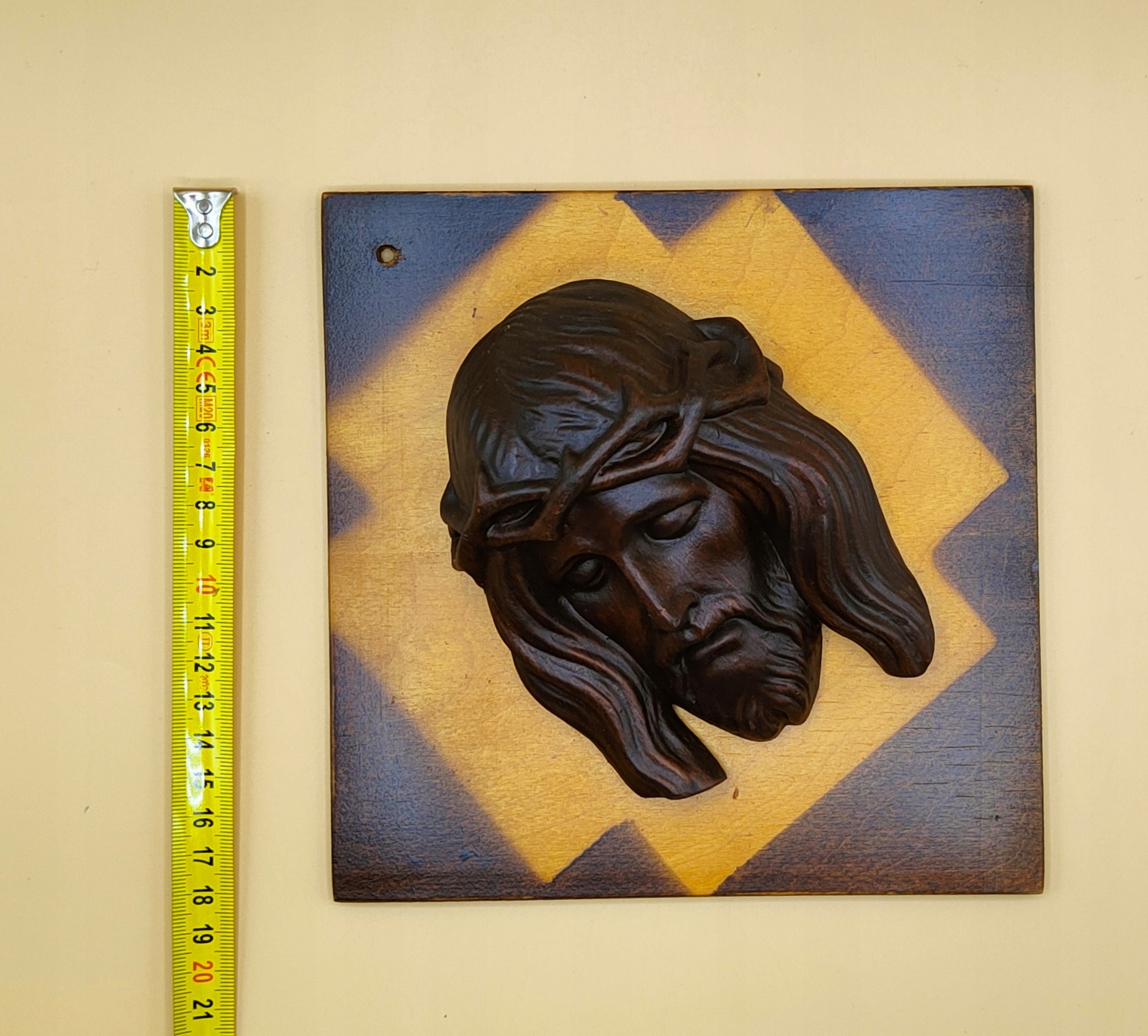 Виготовлено з дерева, голова з металу. Розміри: 18,5 см/18,5 см/6 см. Суцільні дошки, обидві важать близько 1 кг. Ззаду вони мають отвір і їх можна повісити. Це дуже-дуже старі предмети, як бачите, гарні тарілки справляють велике враження, відразу впадають в очі. У житті вони виглядають так само гарно, як і на фото. Рекомендую.